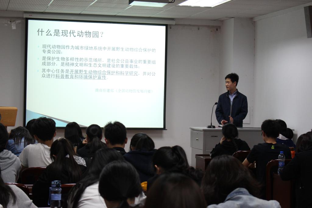 程老师主要介绍了动物园的“四大职能,两大任务”,四大职能即保护教育,物种保护,科学研究,娱乐休闲。动物园不仅仅作为一个公园来娱乐休闲,更是连接自然与城市的桥梁,除此以外,还收集濒危动物的基因库,进行繁殖技术、疾病防治等科研活动。两大中心任务:第一,开展野生动物综合保护和科学研究;第二,对公众进行科普教育与环保宣传。