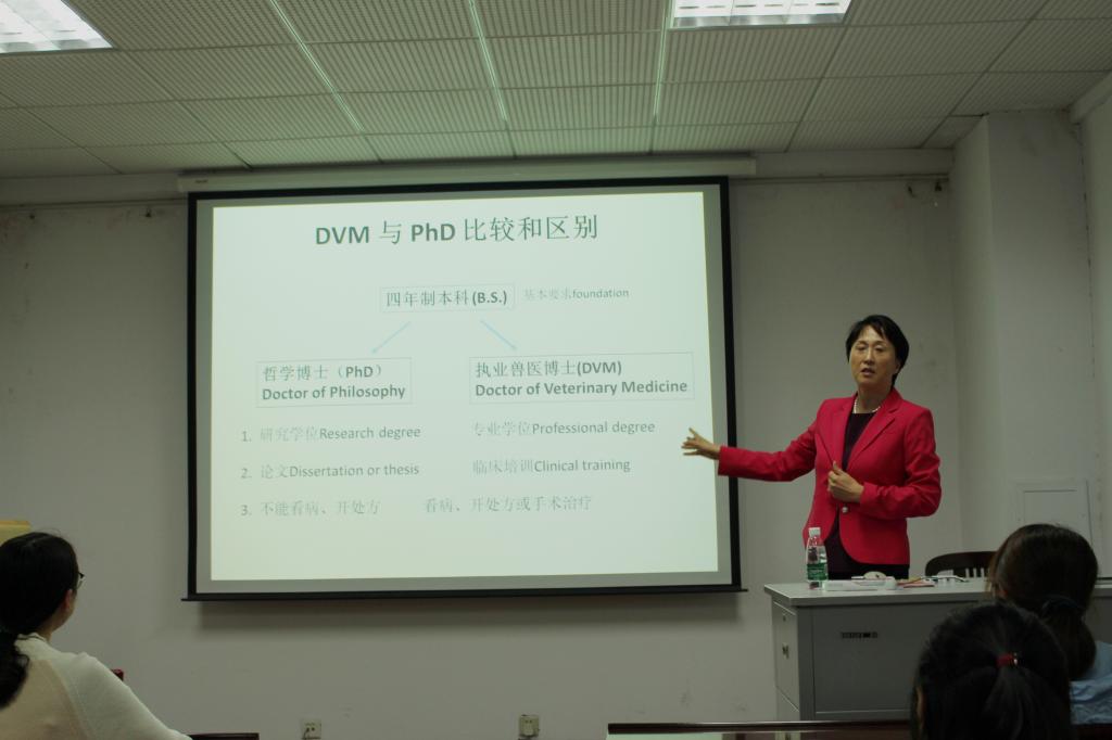 关于申请条件,王主任具体说明了学生在校期间的成绩要求以及DVM项目招收学生的理念以及着重点在于人才的综合素质,她指出“只有愿意服务社会的人才是我们欣赏的”。在项目活动方面,王主任介绍了DVM学子丰富的课程及课后活动。此外王主任还对新开设的PhD项目做了简单介绍。讲座结尾,王主任详细解答了学生的疑问。