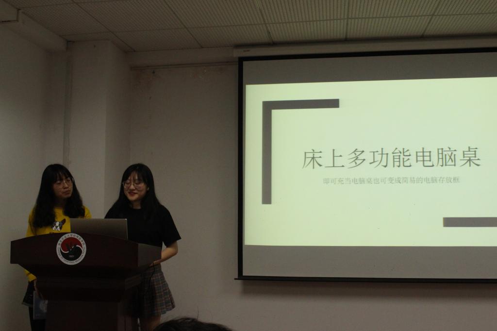 奇思妙想队的作品是床上多功能电脑桌,他们首先讲解了现在市面上普遍电脑桌的缺点,接着介绍了这款产品的优势。