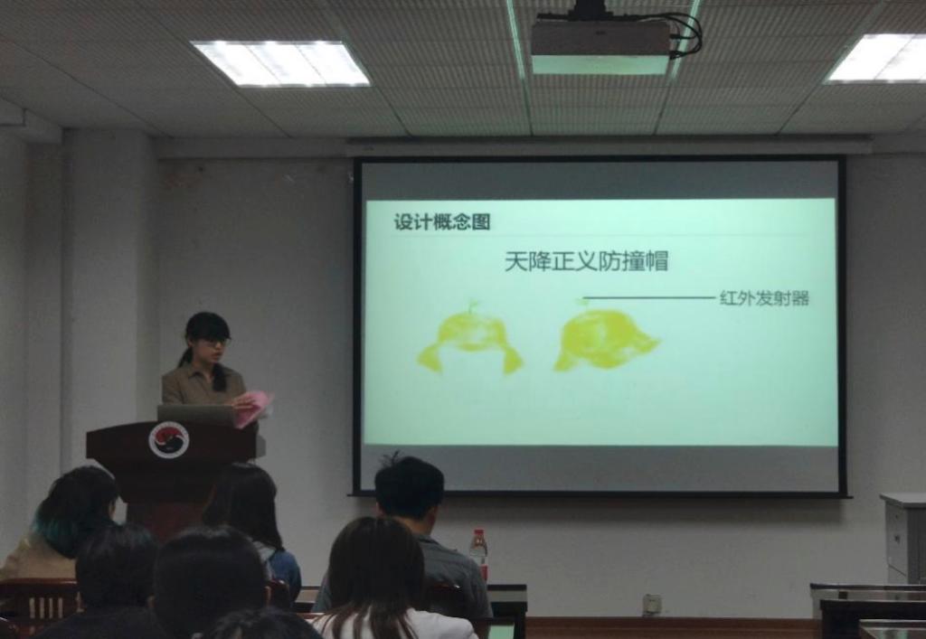 首先展示的是光辉咸鱼队,她们的作品是正义防撞帽,从设计原理到作品本身的实用性都进行了细致的讲解。