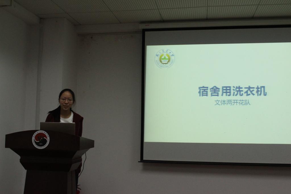 最后是文体两开花队,她们带来的作品是宿舍用洗衣机,将自行车与洗衣机结合,清洗衣服的同时又进行了体育锻炼,一举两得。