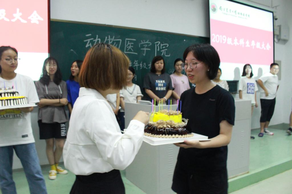 大会结束后,是学院为九月份生日的新生们准备的惊喜环节——党建班团委学生会的成员为十二位同学送上了精美的蛋糕,与全体新生一起为他们庆祝在南农度过的第一个生日。学院的贴心举措让中秋节不能返家的新生们倍感温暖,更易融入动医院这个大家庭。