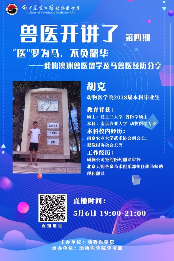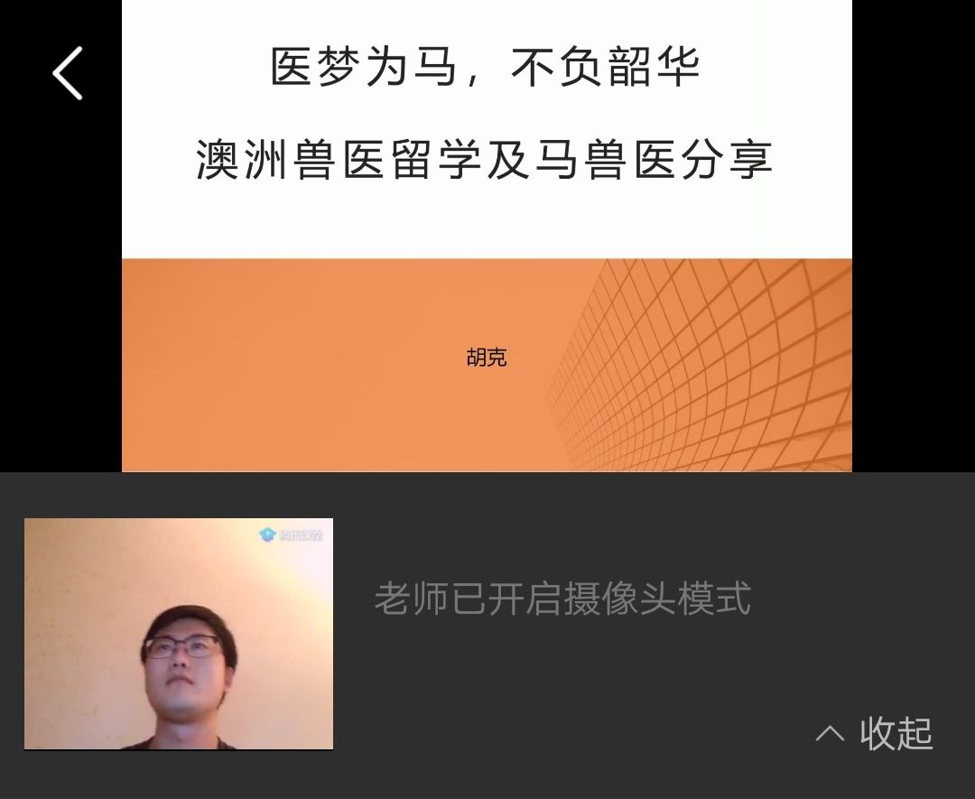 2020年5月7日晚七点,德赢官网通过腾讯课堂成功线上举办“兽医开讲了”第四期“医”梦为马,不负韶华——澳洲兽医留学及马兽医经历分享活动。本次开讲嘉宾为德赢官网18届优秀毕业生胡克,胡克学长前不久获得了昆士兰大学兽医学硕士学位,且有丰富的翻译及马兽医工作经历,吸引了众多动医学子参与本次活动。