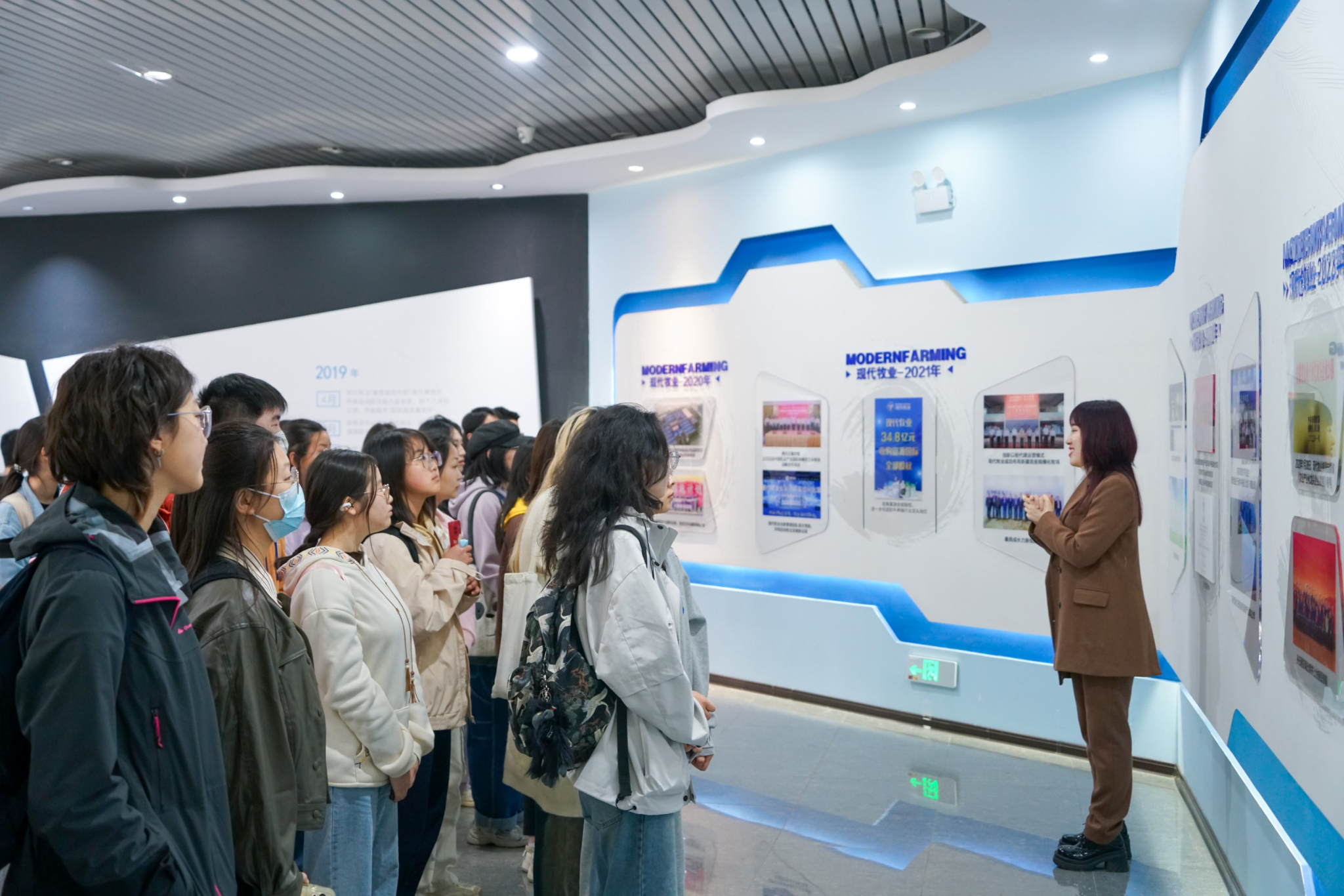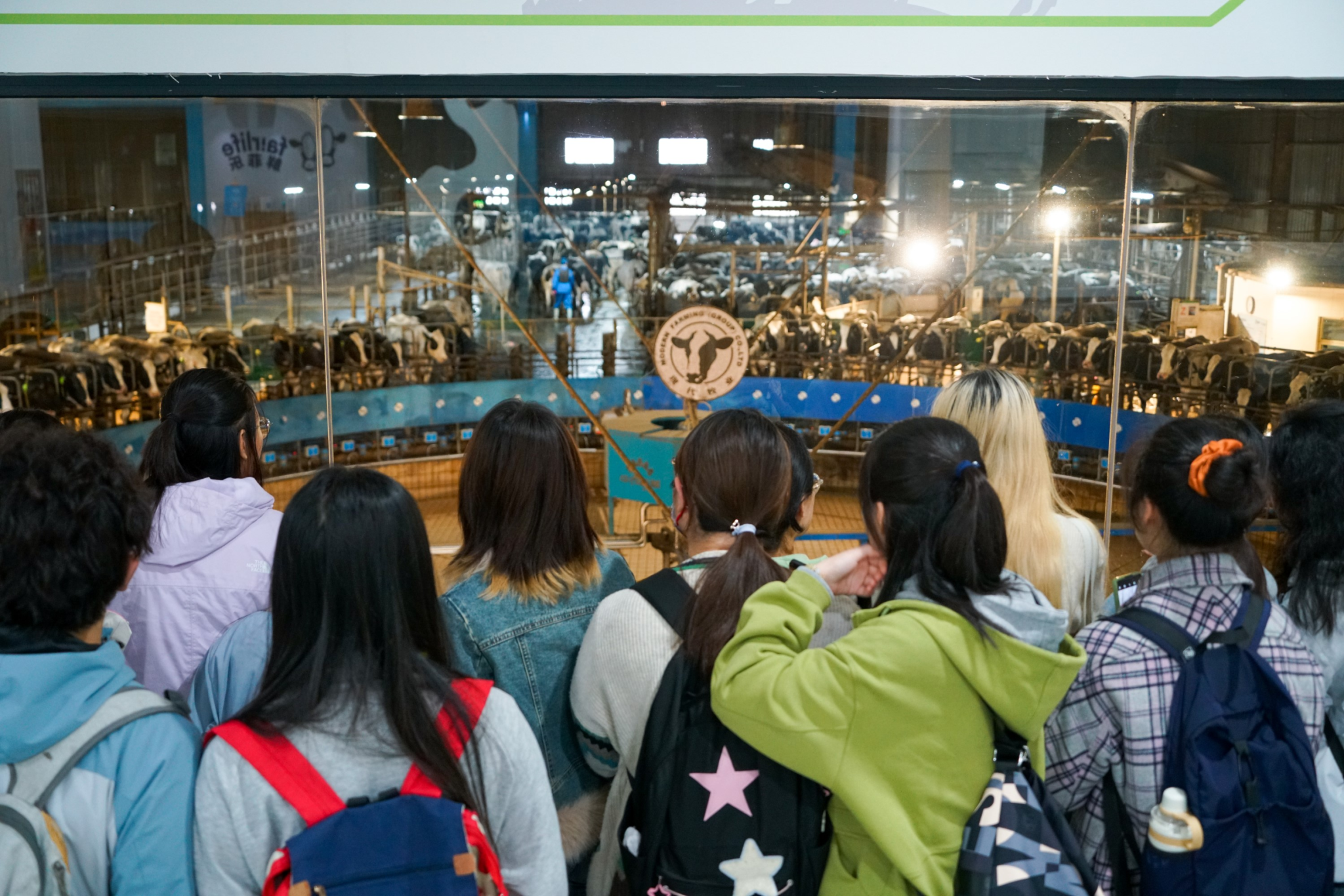 在姚庆场长和郝婧妤经理的带领下,团队一行人走进现代牧业“零距离一体化牛奶工厂展厅”,全面学习、了解现代牧业集团的发展历程、经营理念、企业精神、发展战略和主营业务等内容。参观团近距离观摩了转盘式挤奶系统、自动化牛奶生产线等,并与姚厂长探讨牧场养殖环境条件、奶牛身心健康、人畜共患病的防控等问题,姚厂长耐心且全面地对同学们的问题做出解答。