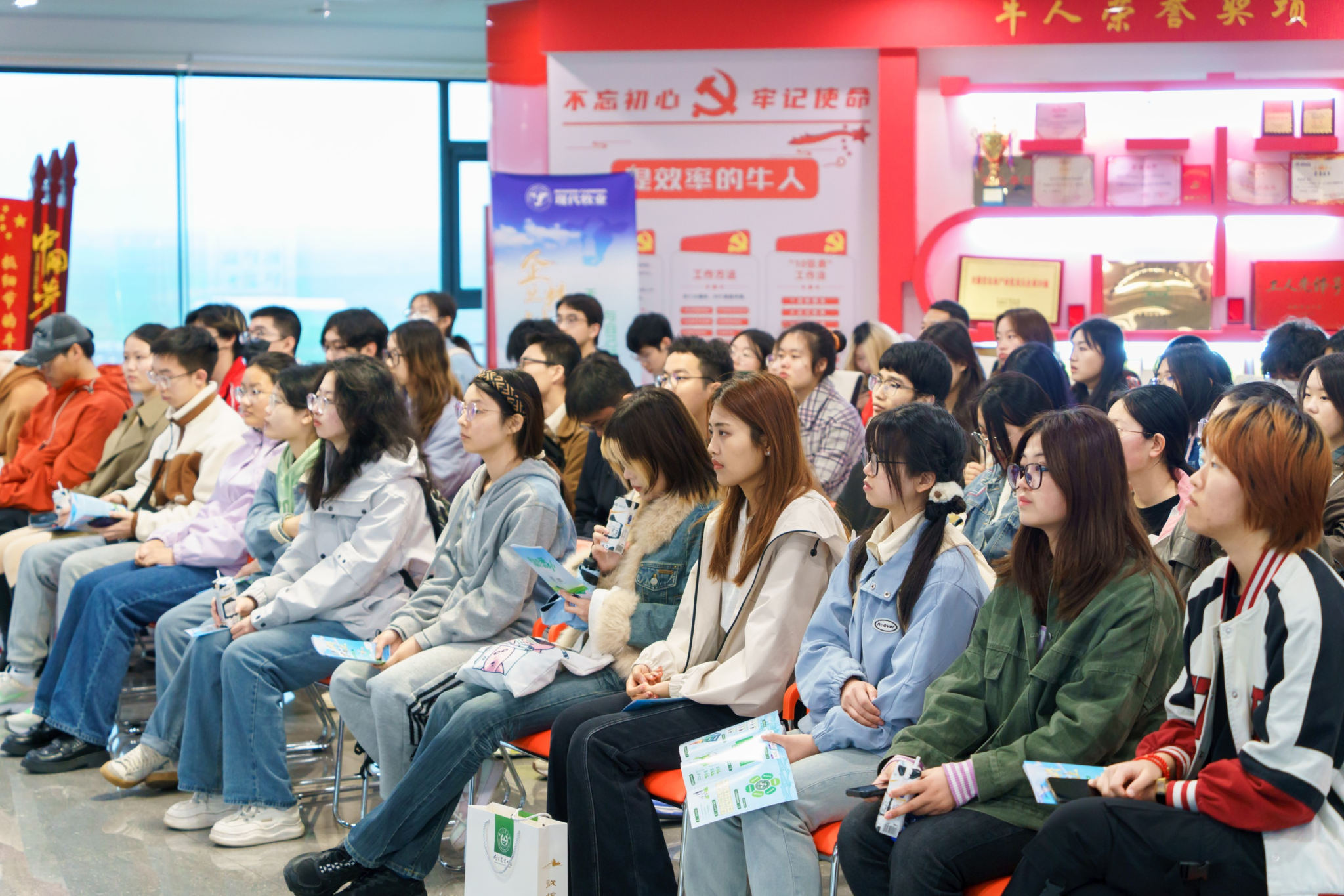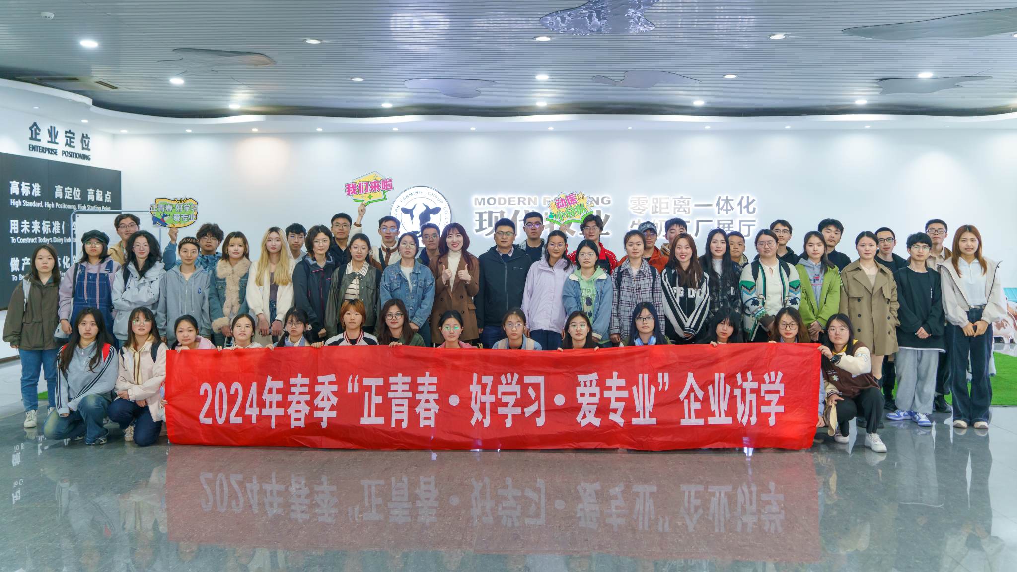 2024年3月24日,在辅导员田文秀的带领下,奶牛产业兴趣协会成员,2023级本科生等一行51人带着“正青春·好学习·爱专业”的口号走进了现代牧业(五河)牧场。
