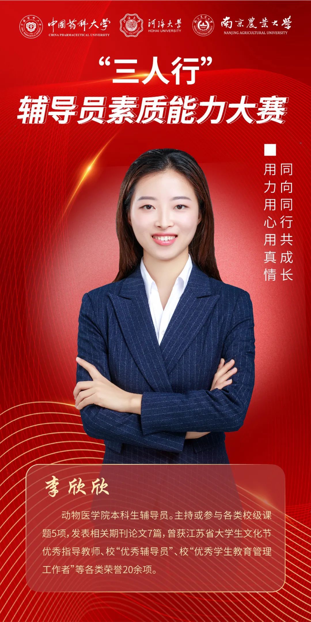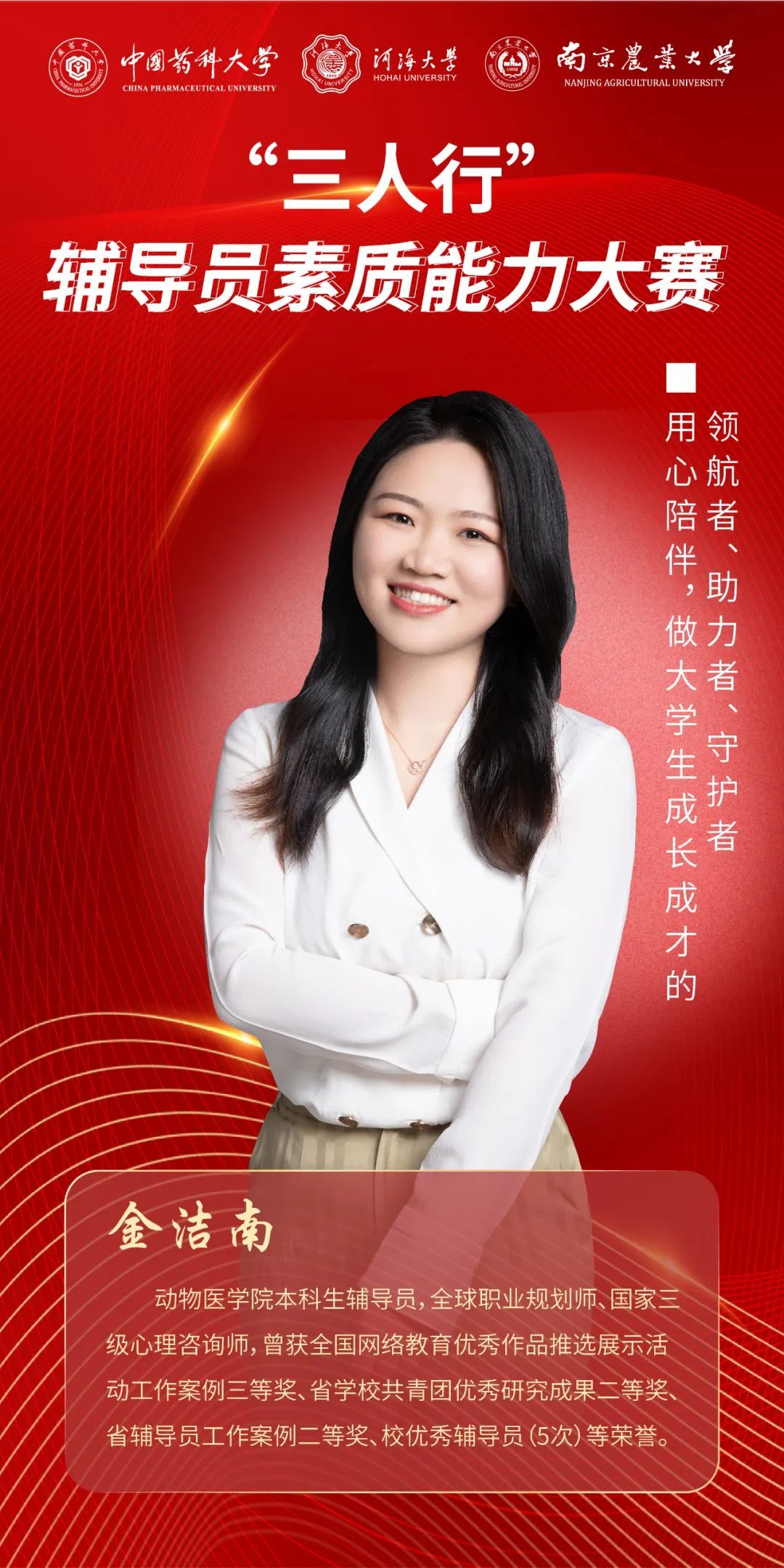 12月7日,由中国药科大学、河海大学、德赢Vwin官方区域合作伙伴共同主办的“三人行”辅导员素质能力大赛如期举行。来自3所高校的12名辅导员经过各自校赛的激烈角逐,脱颖而出进入此次三校联赛。决赛主要包括案例分析和谈心谈话两个环节。经过两个环节的激烈角逐,德赢官网辅导员李欣欣喜获特等奖,辅导员金洁南喜获一等奖!