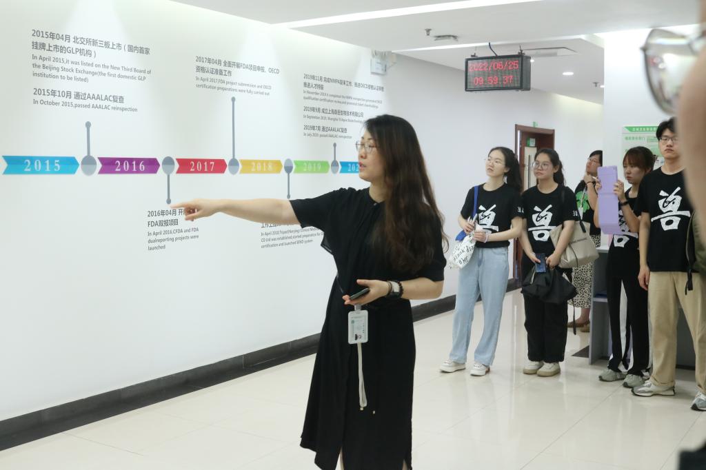 在五楼的展厅,张文婷总监向同学们介绍了鼎泰集团的发展史,江苏鼎泰药物研究(集团)股份有限公司于2008年正式成立,2011年获得CFDA GLP认证,2012年通过AAALACA认证,2016年开展CFDA、FDA双报项目...鼎泰集团稳健发展,现有业务范围覆盖从药理药效学研究、非临床安全性评价研究服务、非人灵长类疾病模型及非临床药理研究、到临床医学、临床生物样本分析、医疗器械非临床研究等。