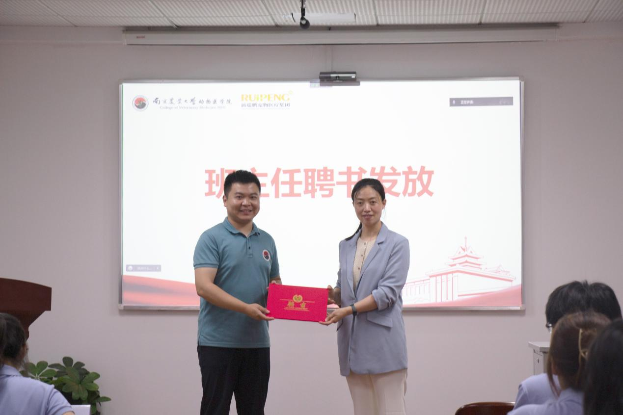 接着,举行第五届新瑞鹏班的班主任聘书发放仪式,班主任由徐刚担任,刘照云为其发放班主任聘书。