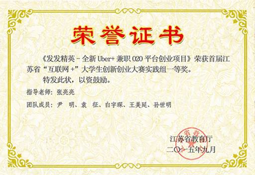 9月14日,首届江苏省“互联网+”大学生创新创业大赛决赛在南京落幕,德赢官网袁征、白宇琛两位本科学生参与的“发发精英——全新Uber+兼职O2O平台创业项目”从全省95所高校的1622件项目中脱颖而出,获一等奖,以实践组第二名的成绩与其他15支项目团队共同组成江苏代表队,参加全国总决赛。