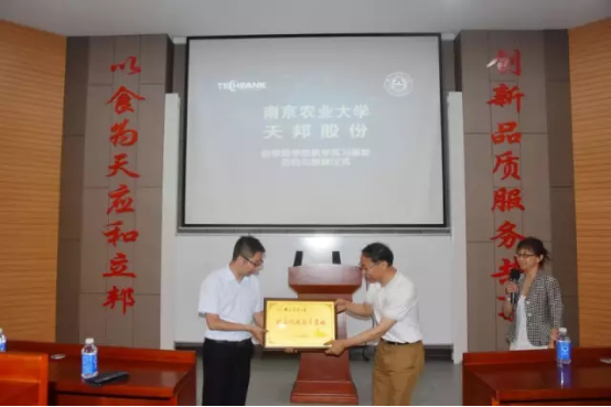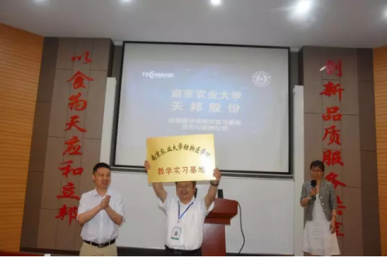 在所有天邦股份新入职员工的见证下,傅衍、朱爱民依次从曹瑞兵手中接过教学实习基地牌匾和就业创业实习基地牌匾,至此实习基地授牌仪式圆满成功。