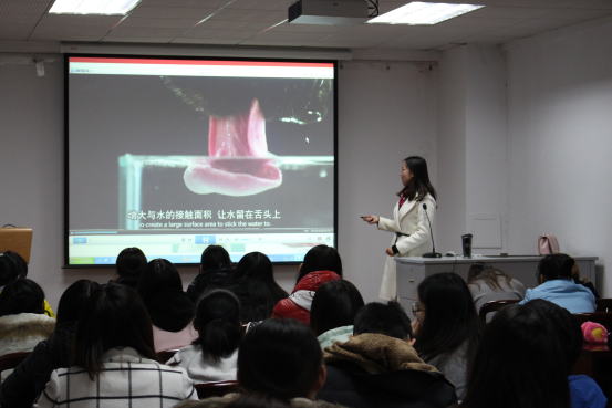 科学地饲养宠物,就需要了解它们的生理特性。李教授接着向同学们比较分析了人、犬、猫三者的生理消化差异,具体展示了他们消化道,牙齿,采食时间的差异,而这些差异与它们的起源有着密切关系。狗和猫的消化道都不太长,牙齿构造也有所不同,所以狗每天进食2~3次,而猫则需少食多餐;狗和猫都靠嗅觉来挑选食物,不同的嗅觉决定了猫、狗粮的不同。最后,李教授还提到一些小常识,比如,犬猫对食物的改变,其适应能力很差;而猫很喜欢流动的水,这些都为我们的犬猫喂养提供了帮助。