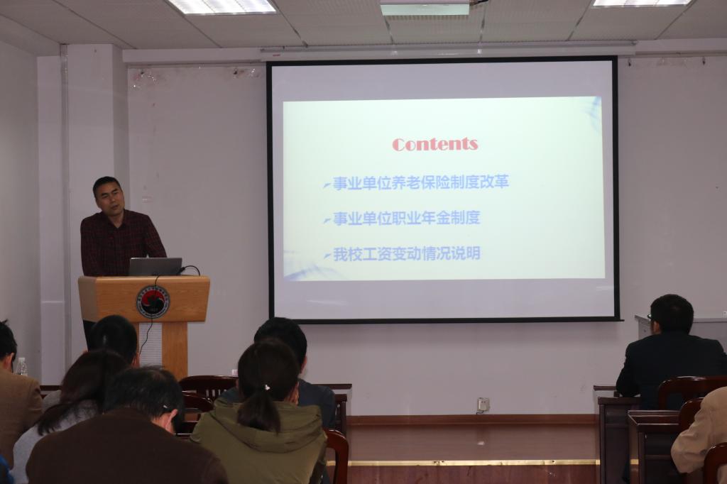 副处长周振雷作了题为《养老保险制度改革及工资说明》报告。从事业单位养老保险制度改革、事业单位职业年金制度、我校工资变动情况说明三个方面做了详解。