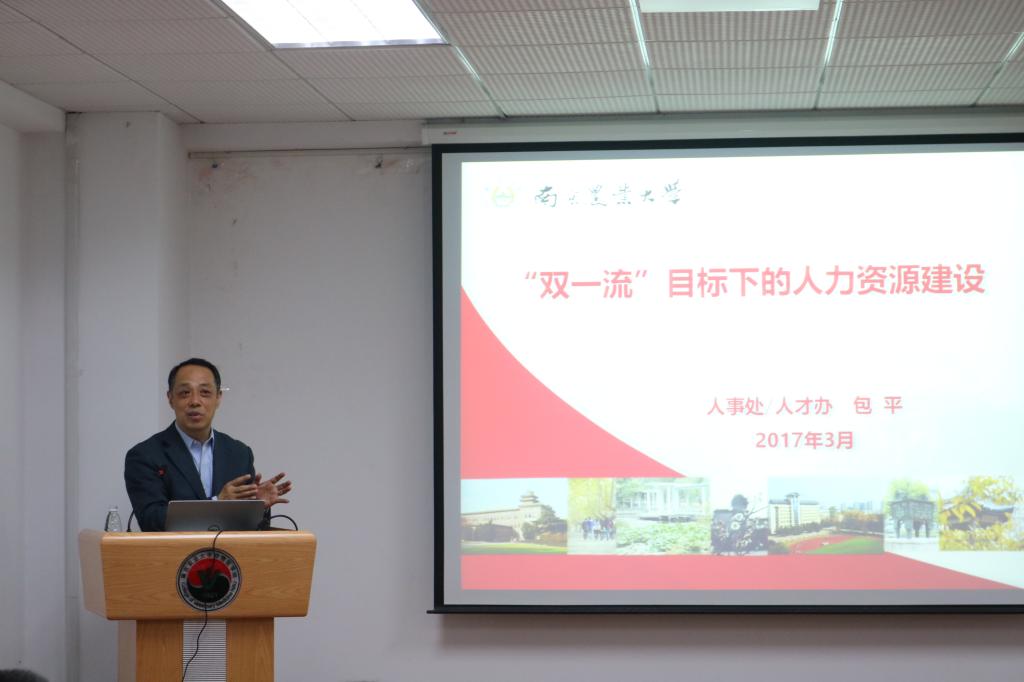 人事处处长、人才办主任包平作了题为《“双一流”目标下的人力资源建设》报告。包平从国家“双一流”建设新任务谈起,分析了高校“双一流”建设的内涵、建设和改革的任务,指出高校应以“一流为目标、学科为基础、绩效为杠杆、改革为动力”加快建设步伐。重点围绕聘任、考核、分配等三类核心问题和“双一流”学科建设的目标和任务,对我校人才和师资队伍建设情况和未来规划作了重点阐释。