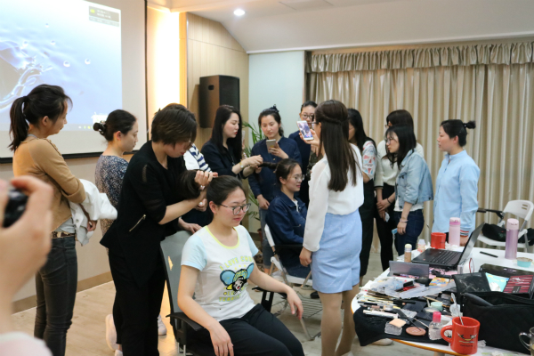 随后,王老师和同行的KK老师通过现场示范教学,介绍了日常护肤的步骤,常用化妆品的挑选,以及职业淡妆的化妆技巧。王老师指出,每一个女生都是美丽的,我们要做的是扬长避短,对人的面部、五官及其他部位进行渲染、描画、整理,调整形色,掩饰缺陷,表现神采,从而达到美容目的。