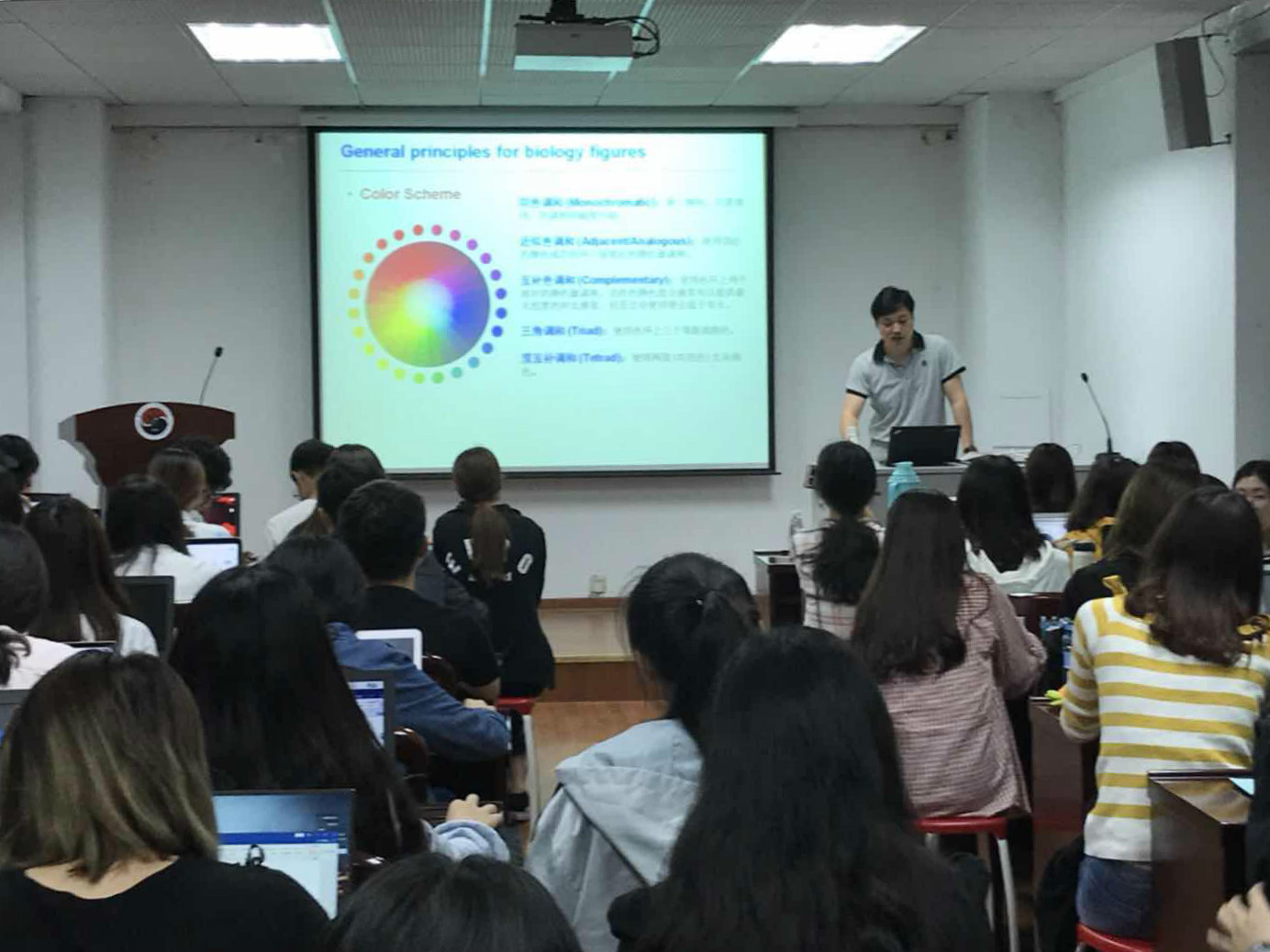 孙钦伟老师首先阐述了科研实验数据分析及图表制作的功能与意义、图表制作的一般规范与要求。然后,孙老师图文并茂地讲解了几种常用科研数据分析及图表制作方法,带领大家认识graphpad prism、endnote等软件在科研中的应用。孙老师还结合色彩艺术概念,强调了配色在图表制作中的重要性,以期在规矩的基础上实现图表的美观和专业。在场同学通过在笔记本电脑上的实际现场操作,加深了对于孙老师讲座内容的了解。孙钦伟老师不仅进行了精彩的报告,更与在场同学积极互动交流,解答了同学们在SRT科研项目中的问题。现场气氛热烈,掌声不断。