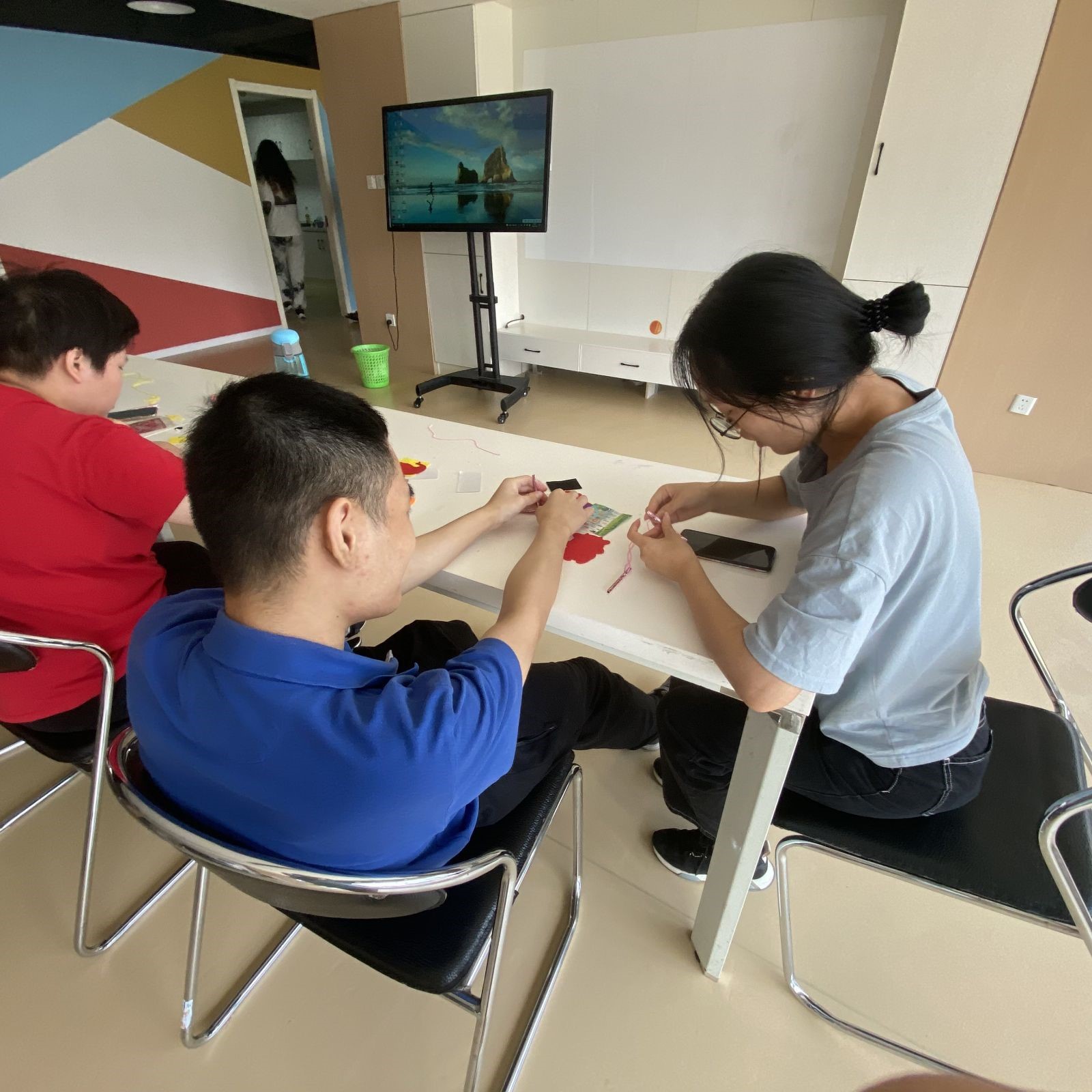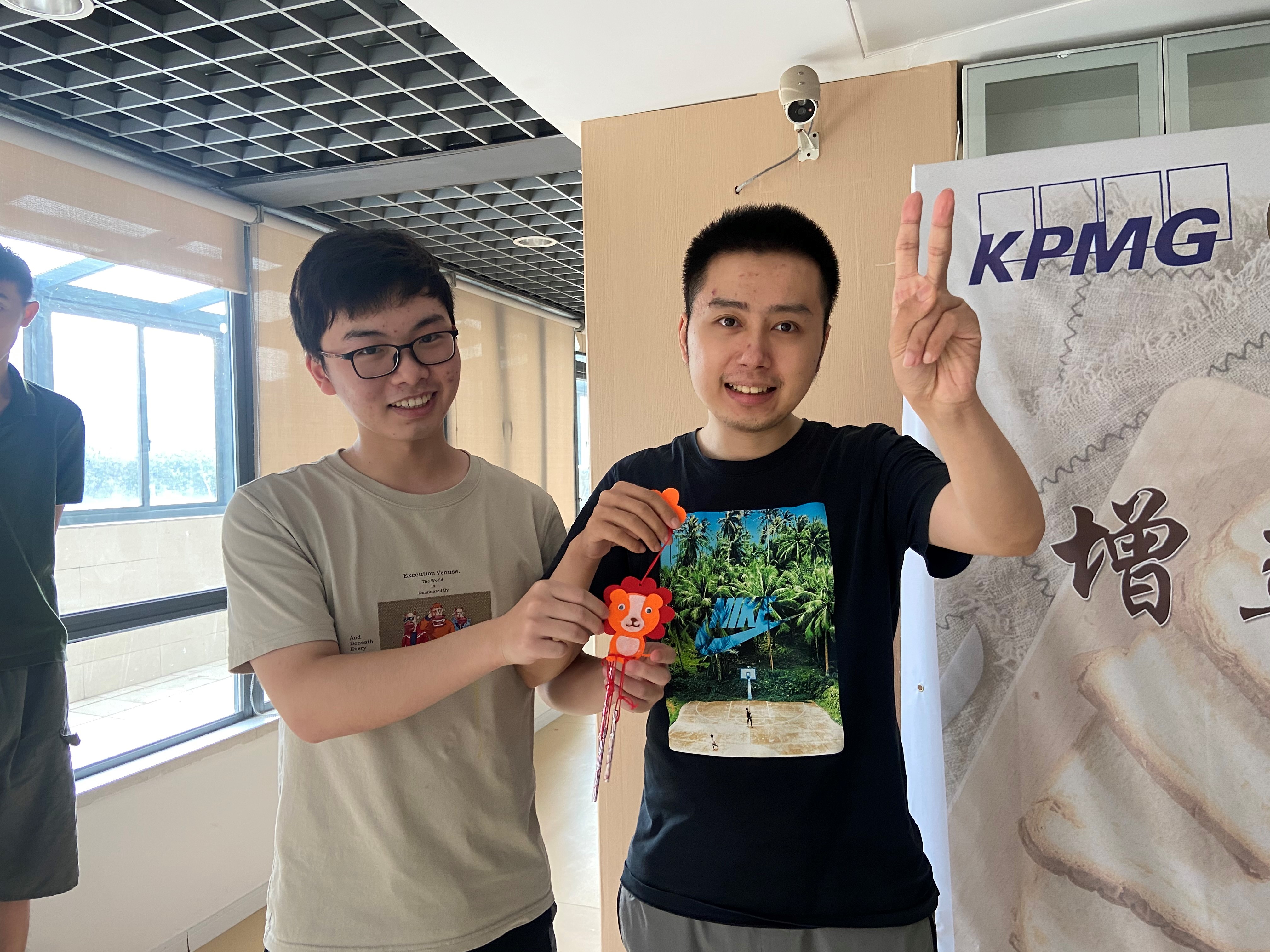 动物风铃的制作环节中,在志愿者的帮助之下,学员按照步骤一点点粘贴、制作,并在其中加入自己的创作想法。制作完成后,学员们互相交换和分享风铃制作心得。