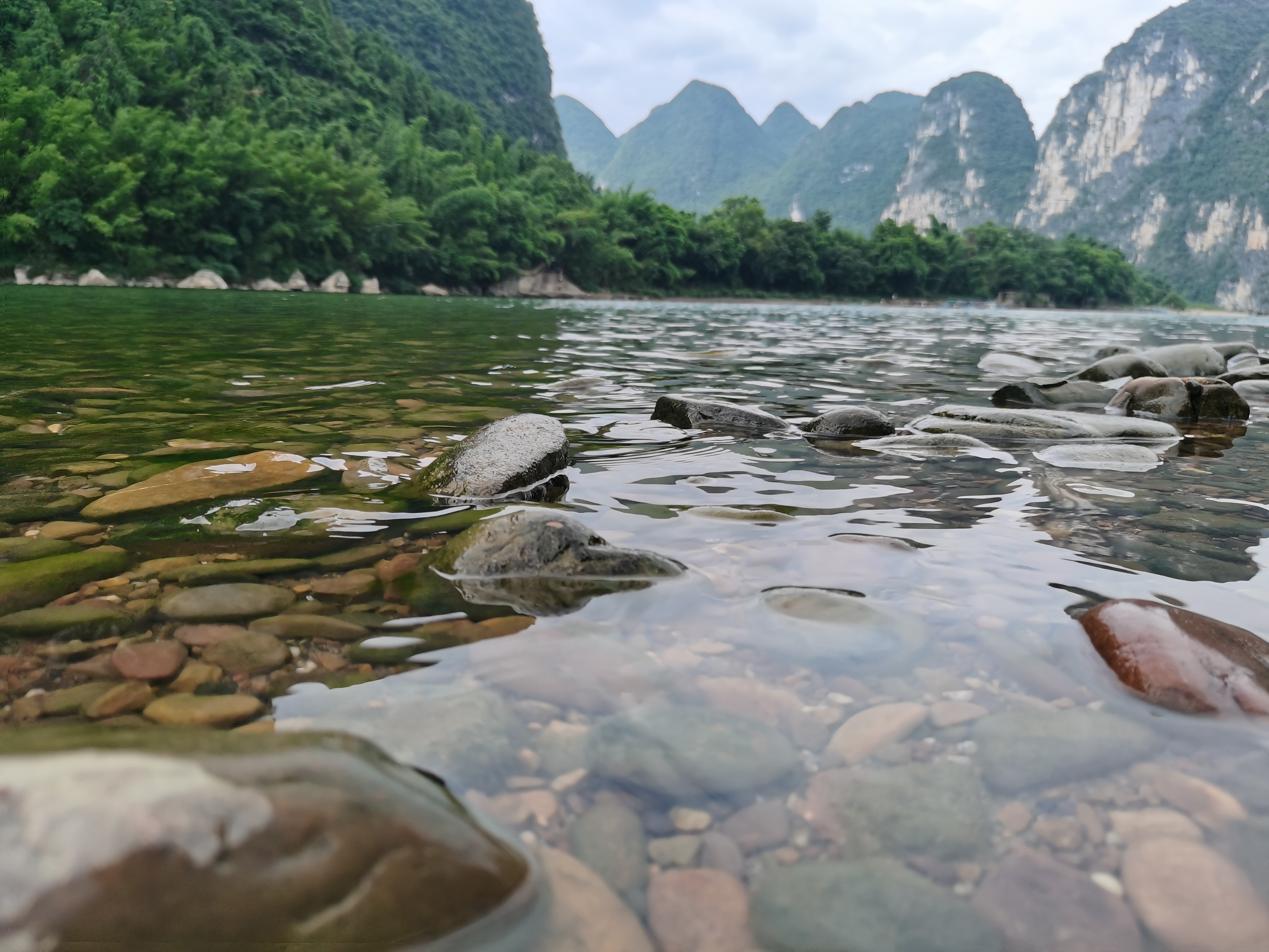 到了杨堤码头,宽阔的视野令大家眼前一亮。拔地而起的山峰连绵不绝、青翠欲滴,云雾缭绕中更是奇雄多姿;清澈见底的水蜿蜒曲折、晶莹翠绿,微风徐徐中更见阵阵涟漪。