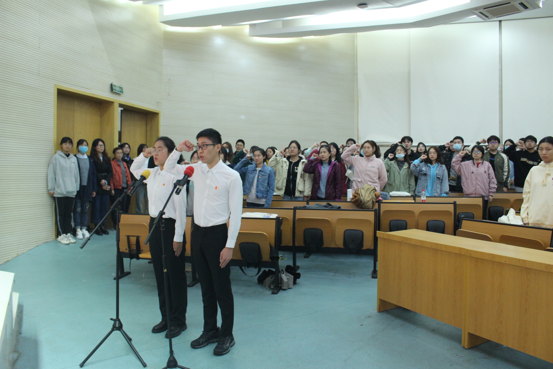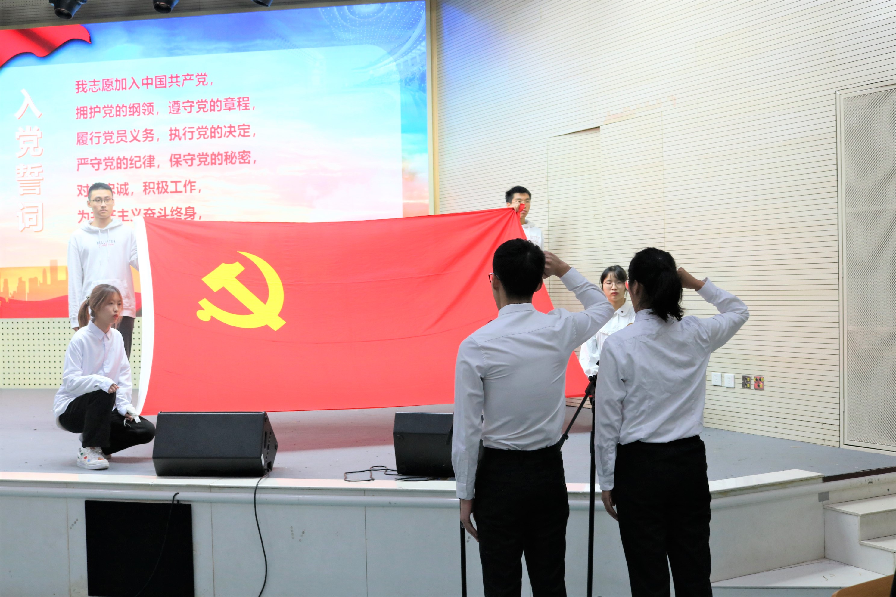 首先刘照云介绍了与会领导老师,在全体起立奏唱国歌后,宣读了2021年3月和6月新发展党员名单,然后新发展党员面对党旗宣誓。