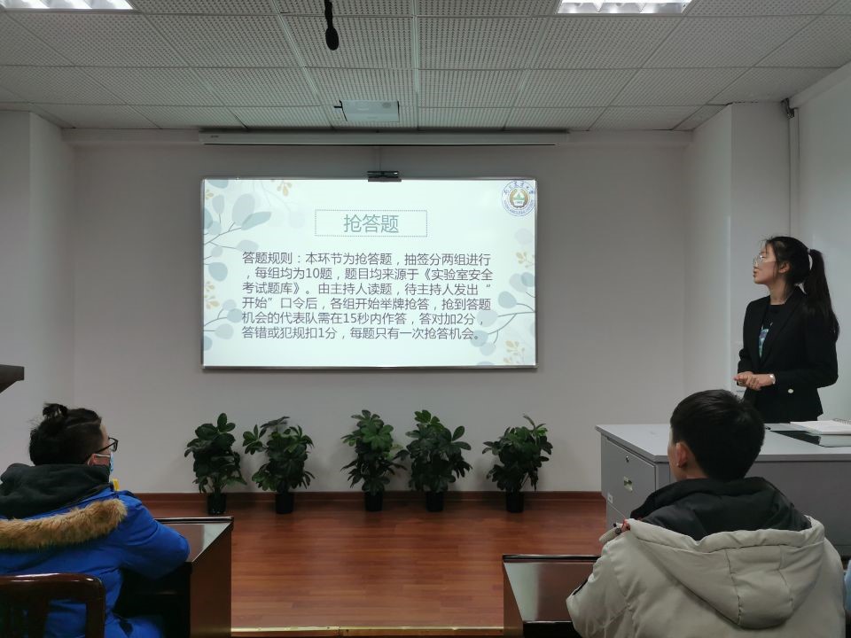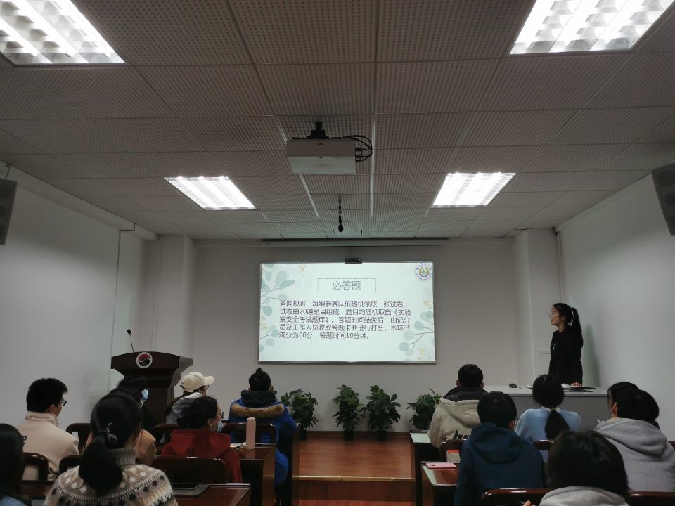 为进一步提高德赢Vwin官方区域合作伙伴研究生的实验室安全意识、增强安全知识与技能,助力安全科研,遴选优秀选手参加校级实验室安全知识竞赛。德赢Vwin官方区域合作伙伴研究生分会组织部于11月11日17:00在逸夫楼3044会议室举办了以“筑牢安全城墙,实验保驾护航”为主题的实验室安全知识竞赛。组织部副部长孙彤为主持人,知识竞赛共分为三个环节。