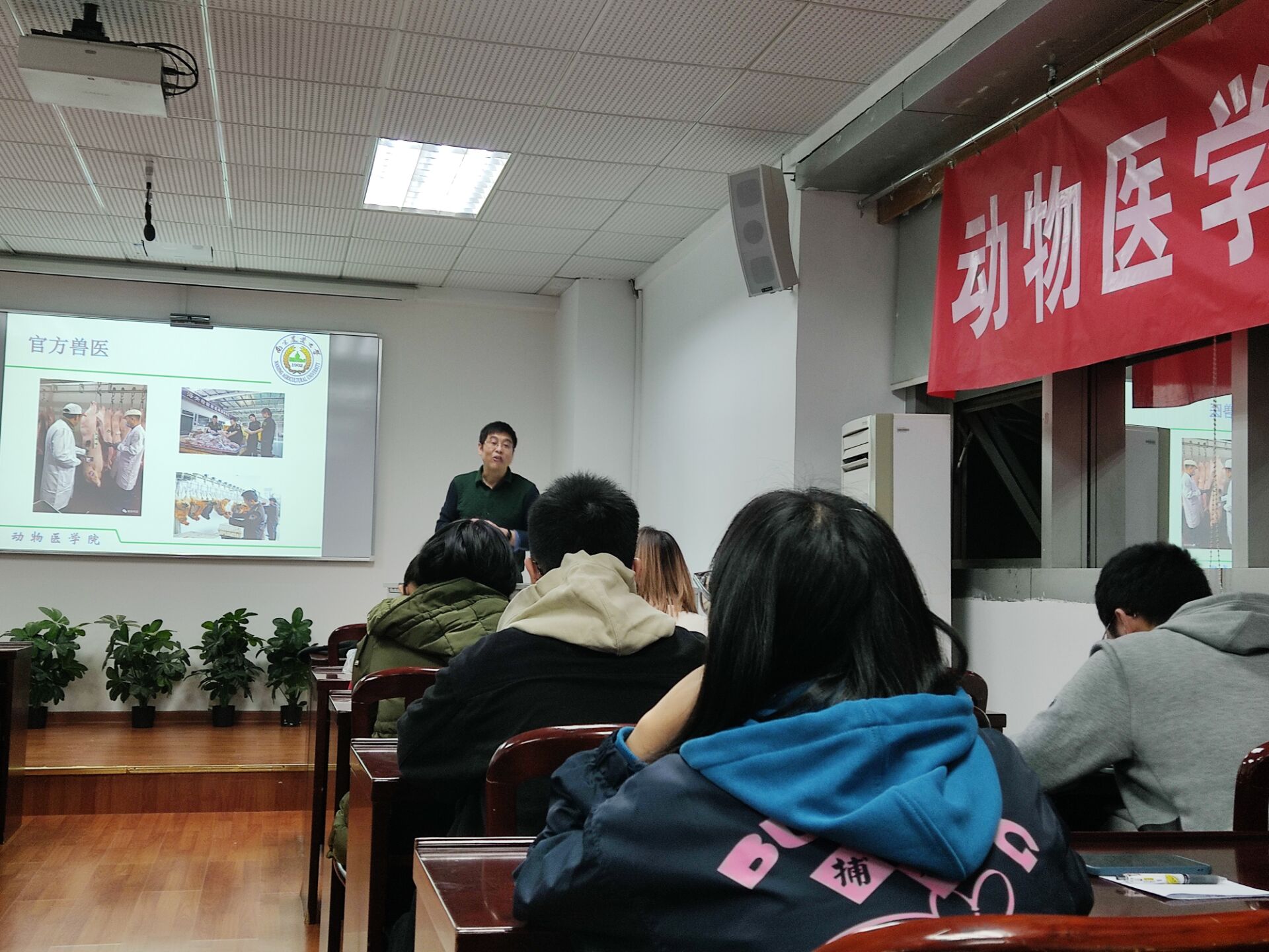 邓益锋副教授以 “如何成为一名优秀的临床兽医”为主题,以自己上大学的经历为引,解读了动物医学专业的有趣之处。通过“非洲猪瘟对中国猪肉价格的影响”、“兽医在克服此困难中的付出”等事例,解读了什么是兽医,医的重要地位和使命,以及兽医岗位的职责分类等,鼓励同学们努力学习,成为一名优秀的兽医。