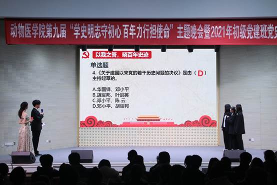 答题结束后由动医类2106班带来《初心》舞台剧表演,带我们探索了红色足迹的起源,重温经典的红船会议。动医类2101班带来《三湾,那一夜》舞台剧表演,为大家讲述三湾改编的故事,让我们知道了是什么时候确立“党指挥枪”“支部建立在连上”的治军方略。