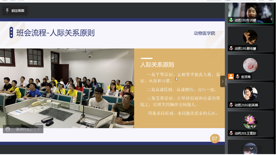 比赛中,2019、2020、2021级各班心理委员按抽签顺序进行PPT答辩,向评委详细介绍了班级召开心理班会的目的、流程、预期成效等。动医193心理委员张楠在汇报中提出“疫情期间,校园采用相对封闭式管理,封校不等于封‘笑’”。