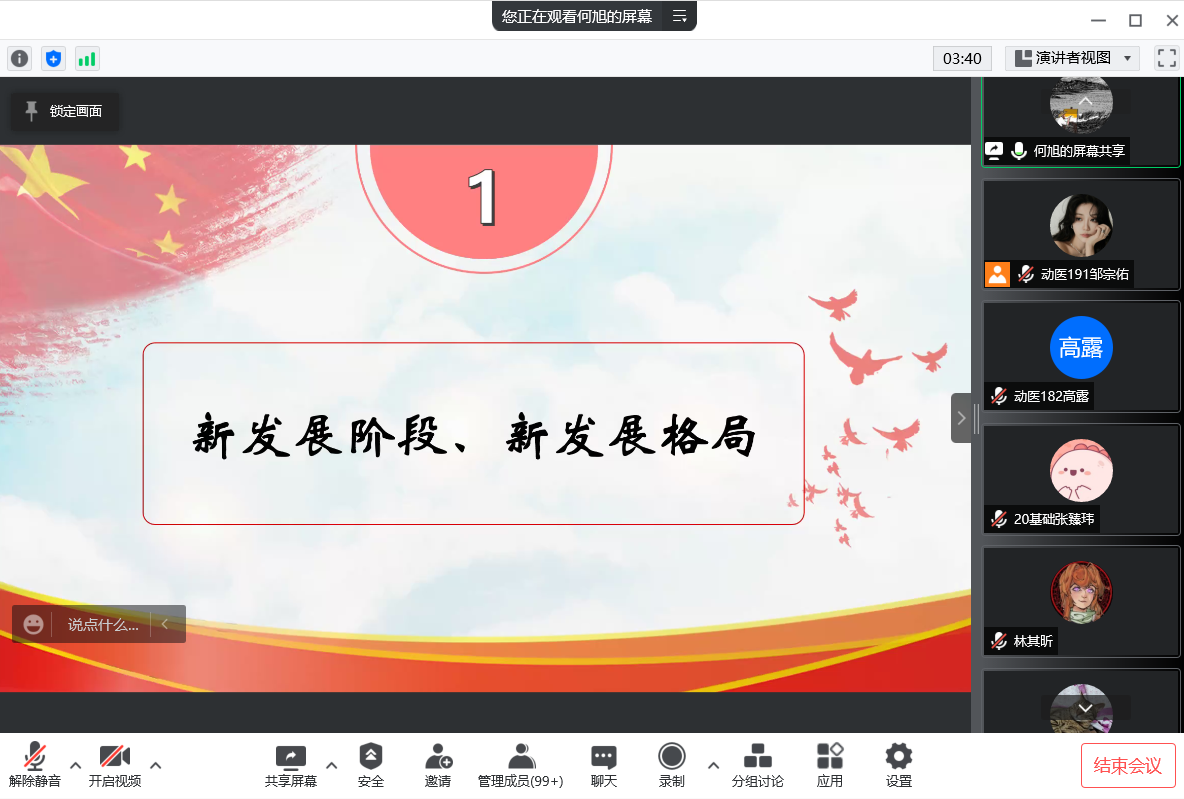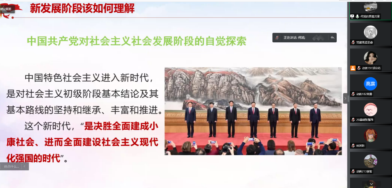 第一部分,何旭以“新发展阶段、新发展格局”为题,向同学们讲解了什么是“新时代”的问题。站立于百年未有之大变局的关键时间节点,我们既要回首,回首我们满是奋斗与成就的过去;更是要展望,展望国家的辉煌与伟大复兴的未来。并且,充分理解马克思所描述的社会主义的两个阶段对社会的发展有着巨大的作用。
