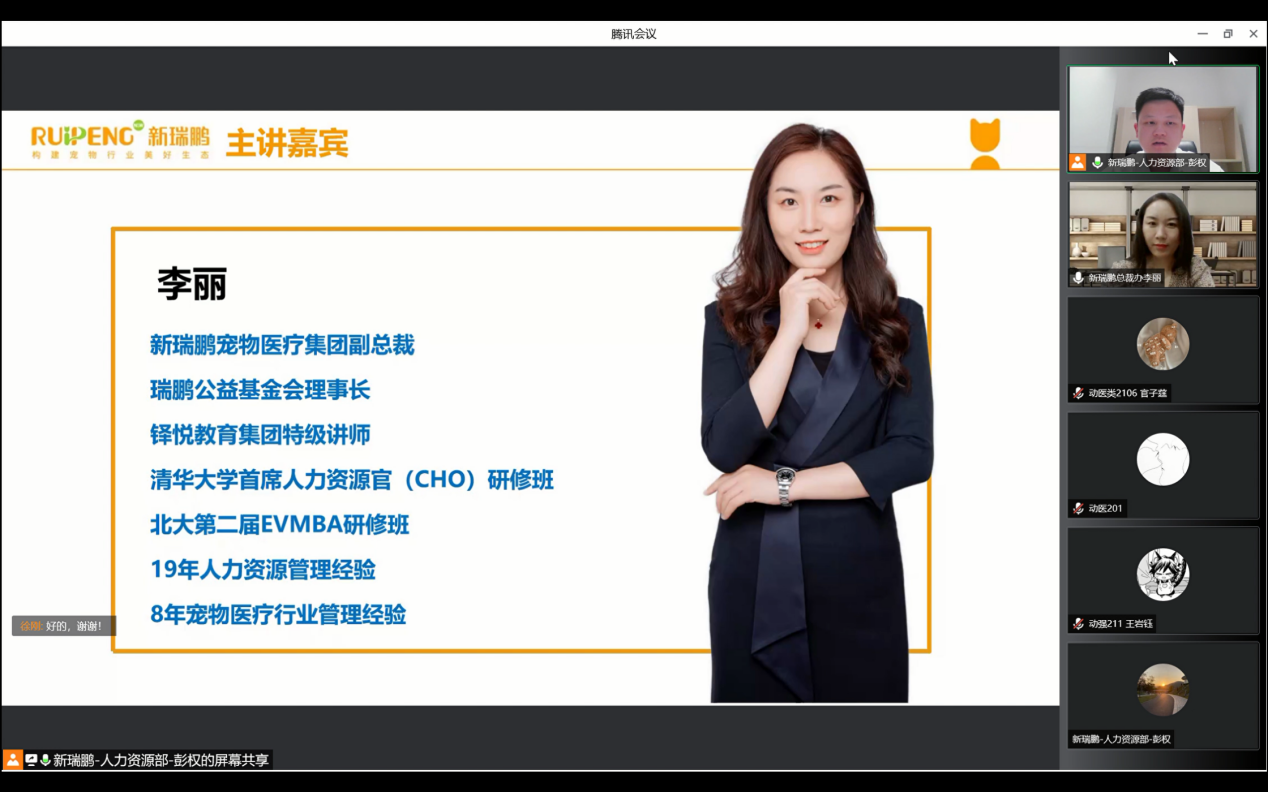 李丽女士分为四个板块,揭秘了快速发展的宠物行业,走进独角兽企业——新瑞鹏,向我们讲解宠物医生行业人才需求概况,以及如何成为一名优秀的宠物医生。会上,同学们和李总积极互动,李总更是热情地为同学们答疑解惑。