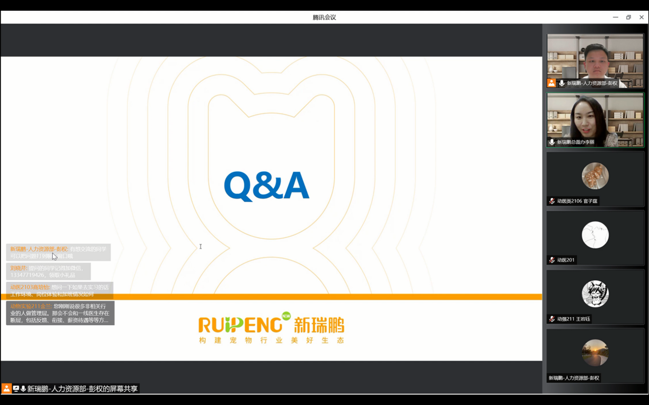 5月5日晚7:00,德赢Vwin官方区域合作伙伴联合新瑞鹏集团举行的“遇见新瑞鹏 遇见新未来”大咖面对面活动在线上如期进行。德赢Vwin官方区域合作伙伴邀请到新瑞鹏宠物医疗集团副总裁李丽女士和新瑞鹏宠物医疗集团南京区艾贝尔医院兽医师袁征先生,以及各区负责人围绕新瑞鹏宠物医疗集团为同学们介绍宠物医疗行业的发展状况。