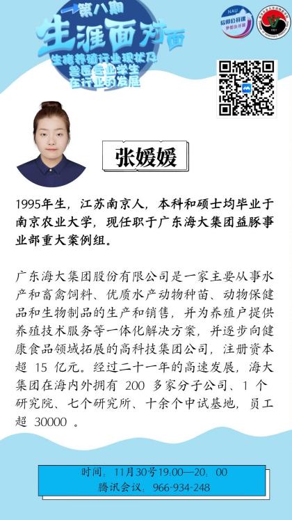 11月30日晚上7:00,第八期生涯面对面暨朋辈领航说--企业求职专场活动在腾讯会议上成功开展。本期活动邀请了两位在生猪养殖行业工作的兽医专业前辈——代科、张媛媛作为分享嘉宾。本场活动由动医院研究生分会生活就业部、本科生学习部、办公室共同举办,吸引力学院200余人参加,徐刚老师主持此次活动。