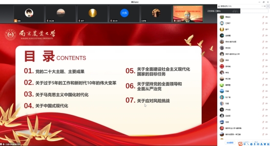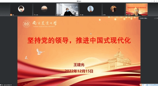 王建光教授作题为“坚持党的领导,推进中国式现代化”的宣讲报告,从党的二十大主题、主要成果,过去五年的工作和新时代十年的伟大变革,马克思主义中国化时代化,中国式现代化,全面建设社会主义现代化国家的目标任务,坚持党的全面领导和全面从严治党,应对风险挑战等7个方面详细解读党的二十大报告精神。