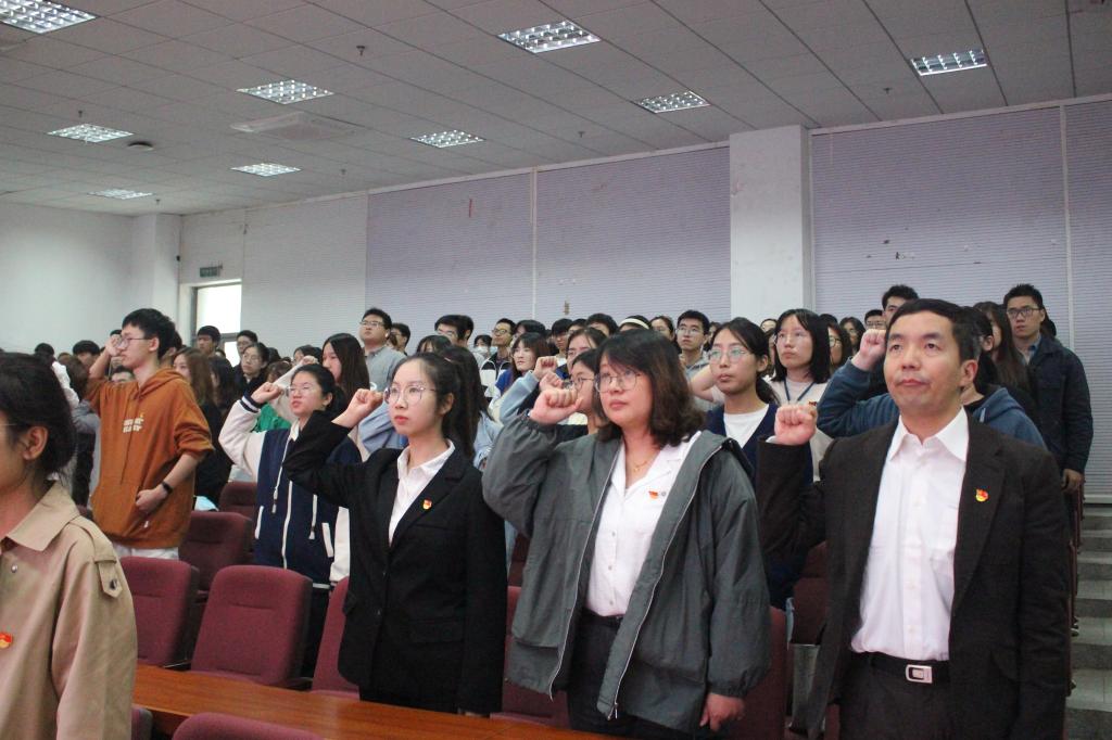 开班典礼上,姜岩为5名新发展党员代表佩戴党徽,32名新发展师生党员面向党旗进行庄严宣誓。李云锋宣读了学院2022年上半年新发展党员名单。