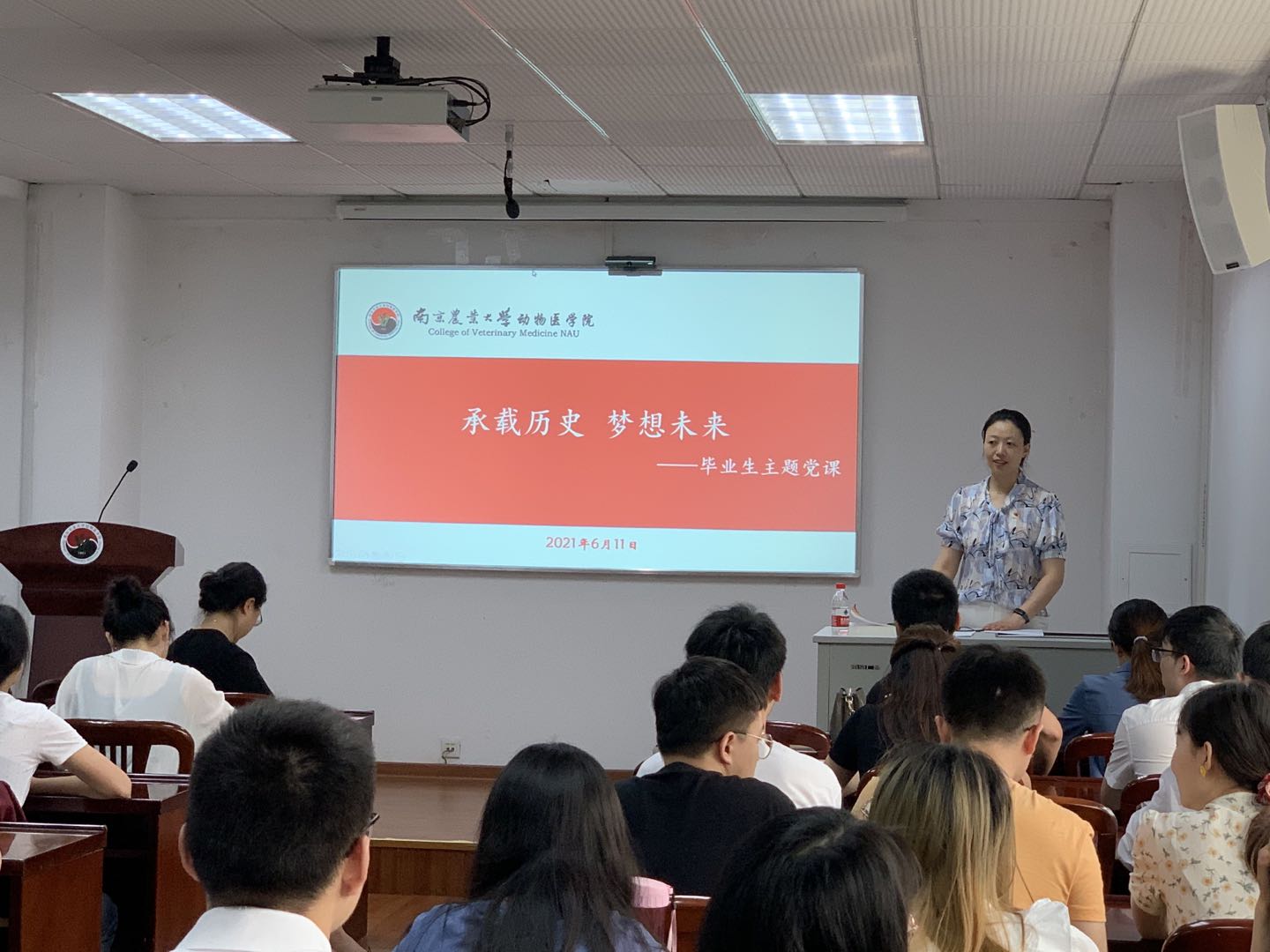 最后,毕业生党员代表为在校生寄语。基础兽医学党支部张静静说“‘勤学不辍,做合格神农传人,薪火世传,固我华夏之本’,而今,愿大家能带着这份信念走向未来,做新时代的追梦人”。预防兽医学党支部谢盛达表示“建党百年之际,愿各位同学以梦为笔,不负韶华,点梦未来”。
