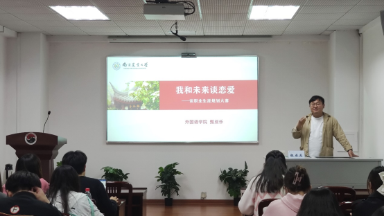 甄亚乐围绕生涯规划书的两个模块——规划书以及访谈报告两个方面展开培训,提出要把比赛当成考虑自己未来发展的机会,把比赛当成全面锻炼自己的平台。甄亚乐用谈恋爱的过程作比,把未来当成自己的另一半,以谈恋爱的过程推出职业生涯规划的步骤,并以省赛的优秀选手的规划书作为案例,讲解与案例结合,向同学们展示了如何撰写一份优秀的生涯规划书。