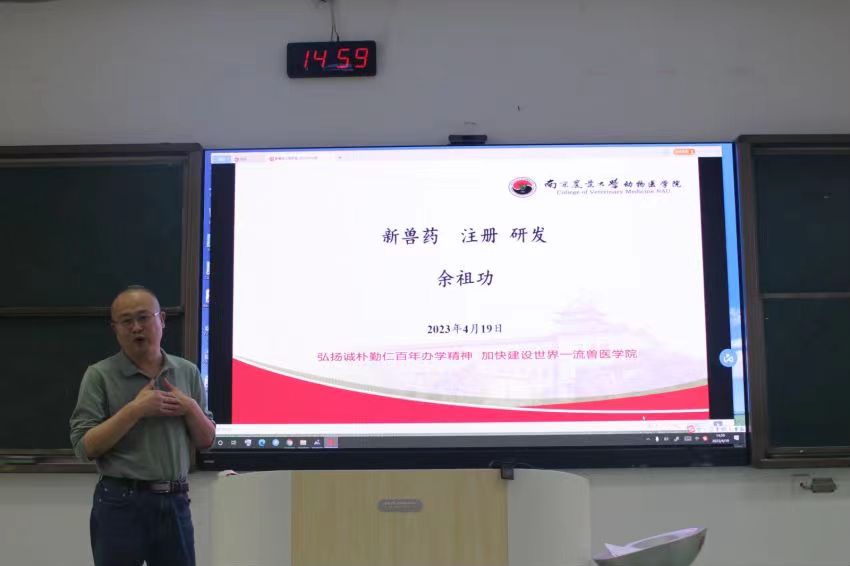 随后余祖功教授以“新兽药研发与注册”为主题,从解释新兽药的“新”开始给同学们讲述了兽药注册审批相关流程法规,以“奶牛乳房炎”为例讲解了何为“比较优势”,并强调新兽药的未来将朝着智能化、便利化、最优化方向发展。余祖功教授随后对处方药、药理毒理、临床以及药物残留研究进行了专业讲解。