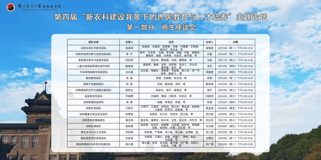 5月15日至5月30日,德赢Vwin官方区域合作伙伴第四届“新农科建设背景下的兽医教育与人才培养”主题论坛第一阶段师生座谈会活动顺利举办。半个月里,基础兽医学、预防兽医学、临床兽医学3个专业方向,17支科研团队分17个场次,共计300余人次本科生参加了本次活动。