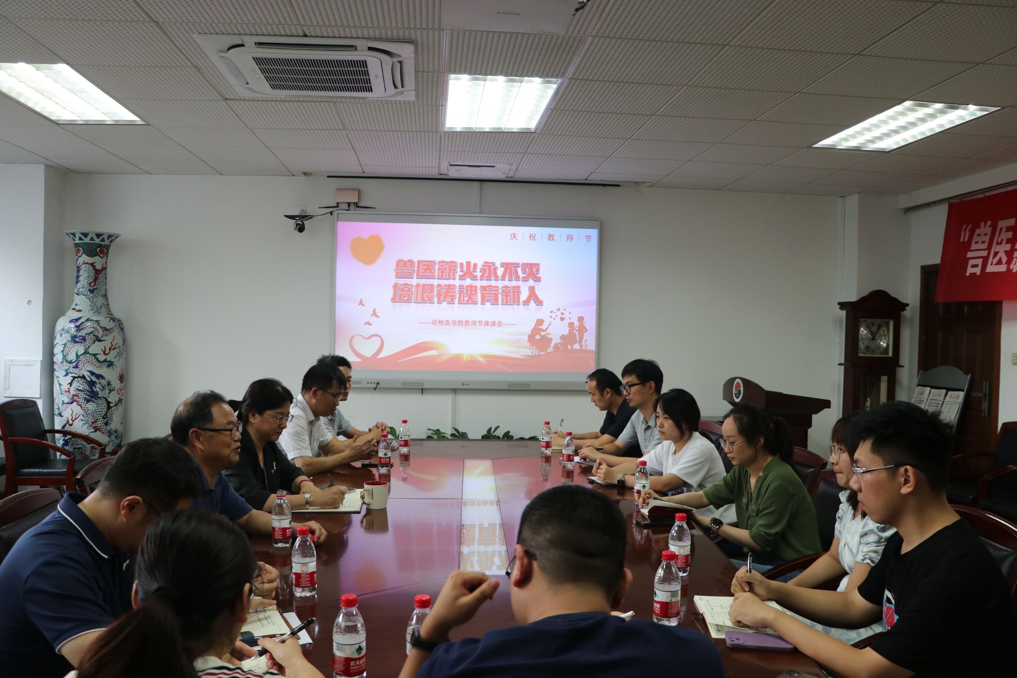 为庆祝第39个教师节,贯彻落实立德树人根本任务,进一步加强老教师“传帮带”作用,激发新教师教书育人的责任感、使命感、荣誉感和职业认同感,德赢Vwin官方区域合作伙伴党委联合工会于2023年9月6日下午2:00在逸夫楼3036举办了“兽医薪火永不灭,培根铸魂育新人”新老教师座谈会。学院领导班子、退休教师代表、新进青年教师参加了本次活动,活动由学院工会仇亚伟主持。