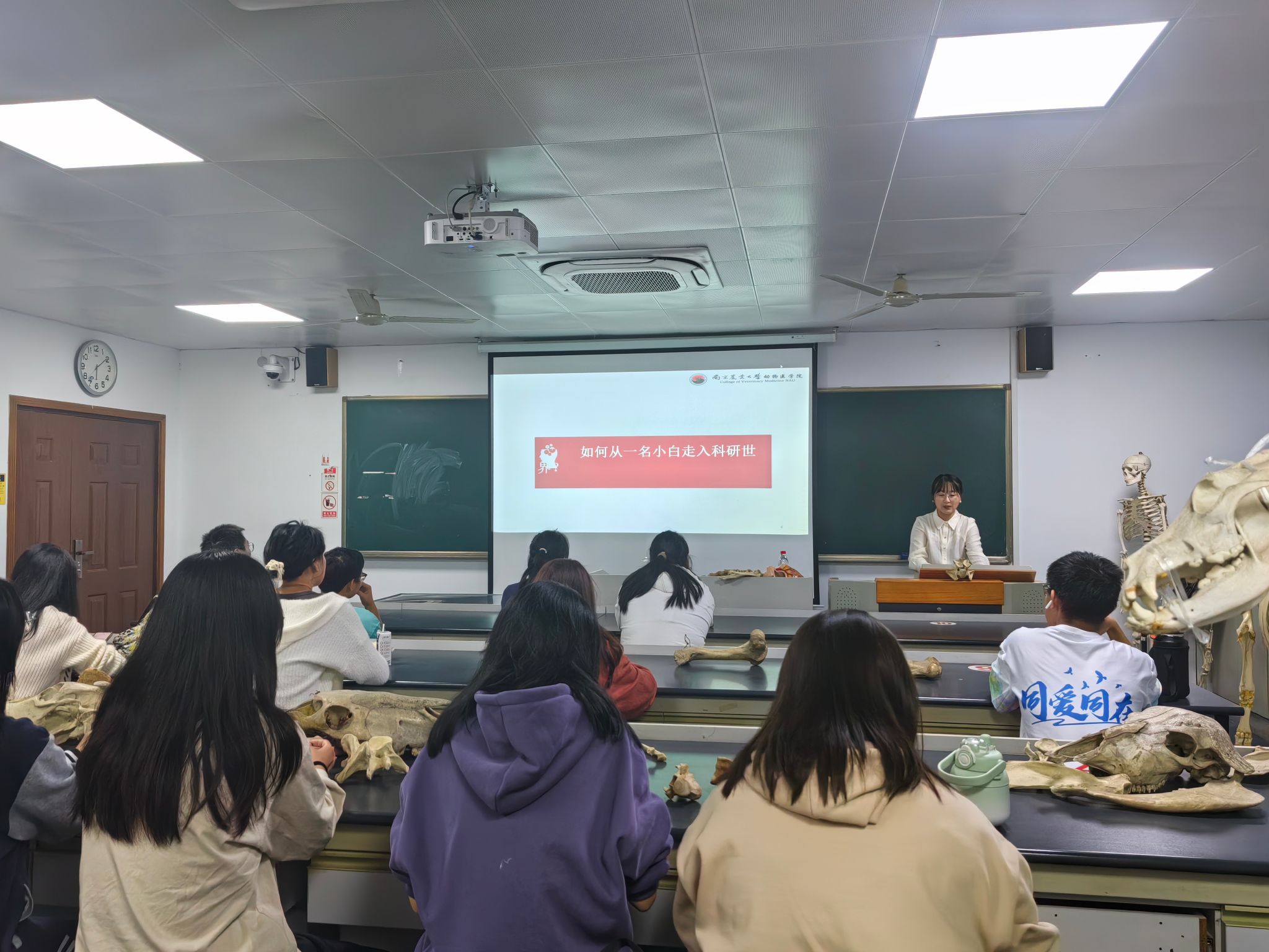 张艺佳以“如何从一名小白进入科研世界”为主题开展了此次研讨课。她通过介绍自身的科研过程,从选题到同导师师姐交流学习到最后的创新带领同学们探索科研世界,指出科研要以自身的兴趣爱好入手、从实际观察到的现有现象出发、仔细研读大量文献。她指导同学们如何从科研世界中寻找快乐,加入有意义的社团提升自己的交流能力,不畏惧展示自己,学会良性竞争,不要过多在意他人的眼光和看法等。