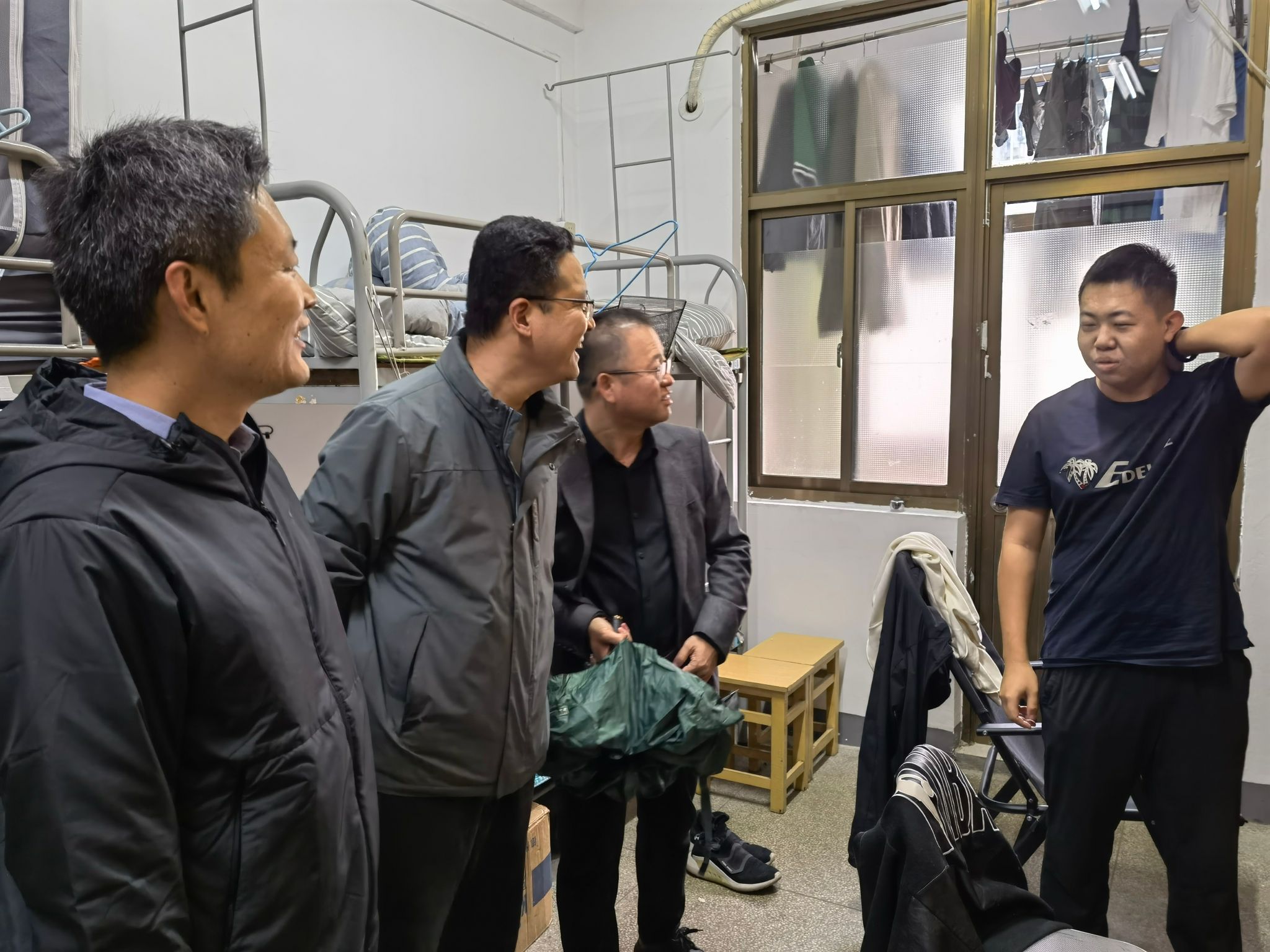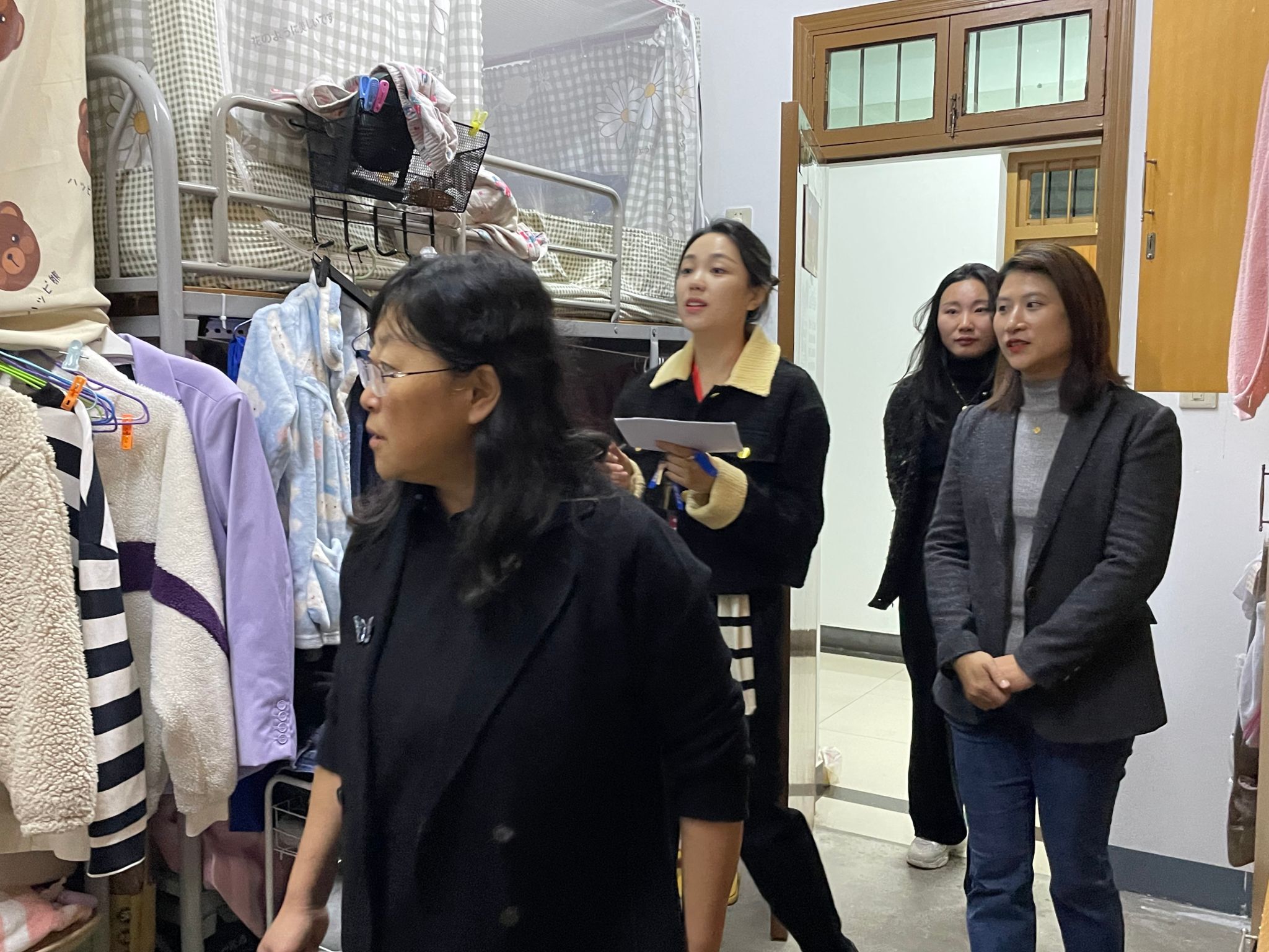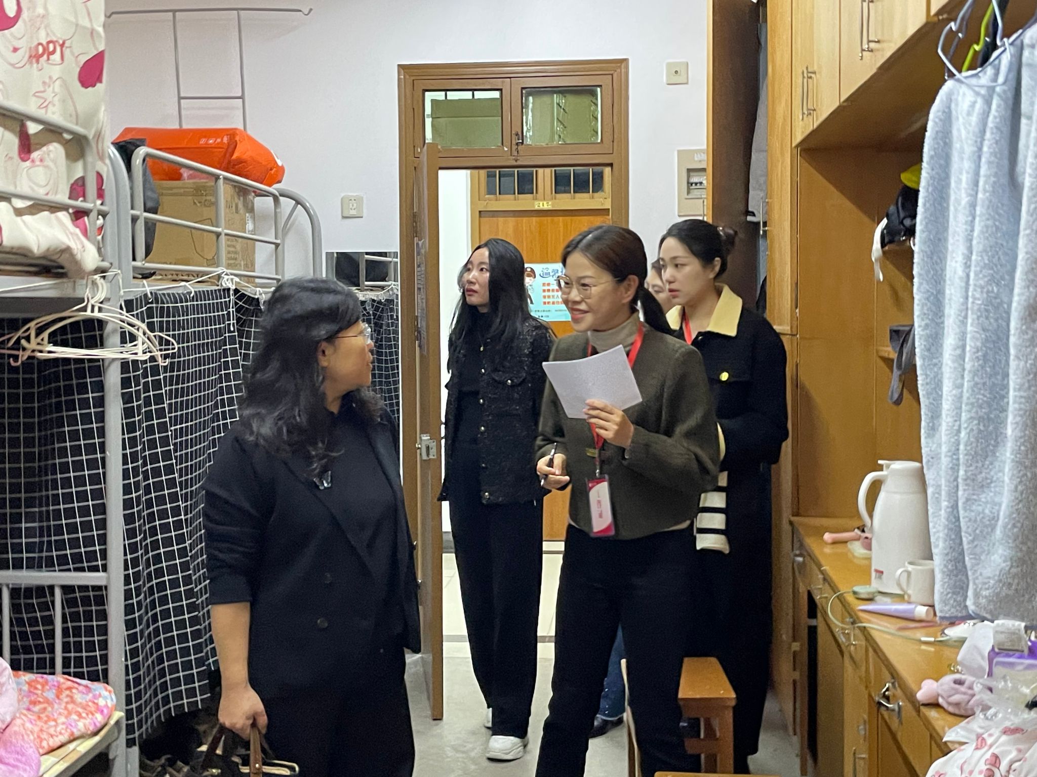 同时导师们也与同学进行亲切交谈,从中了解学生最近的学习生活情况,并叮嘱同学们不仅要遵守宿舍管理制度,还要自觉提高卫生与安全意识。当下是传染病的高发季,平时要勤开窗通风,保持宿舍整洁干净,做好个人卫生防护。