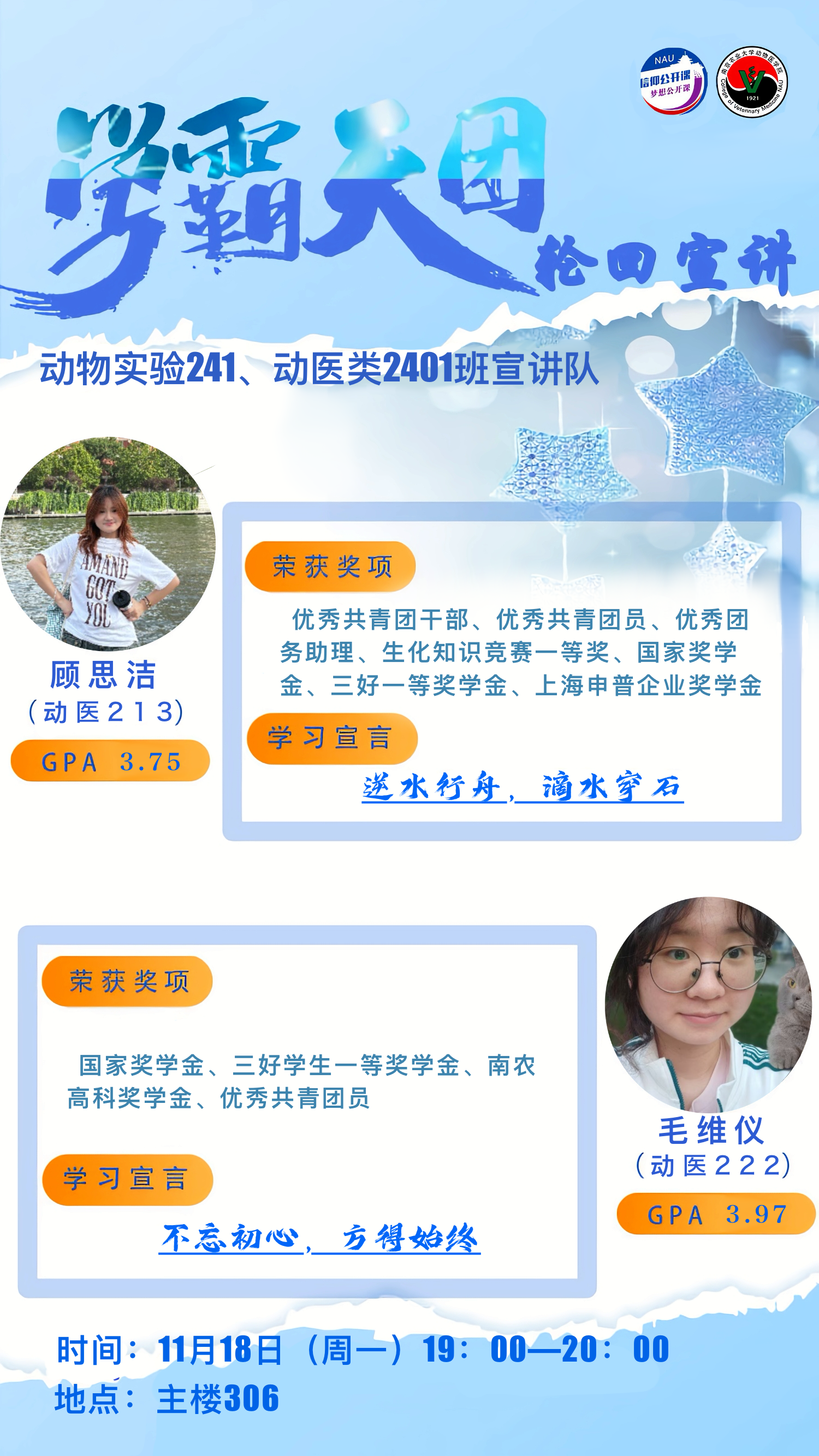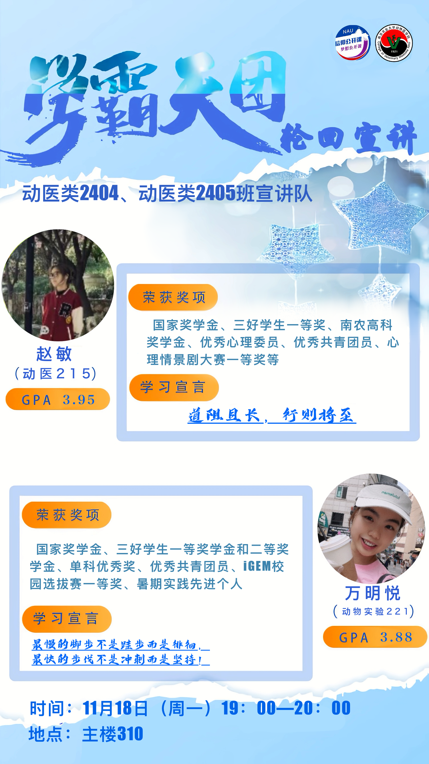 2024年11月18日,德赢Vwin官方区域合作伙伴“学霸天团”轮回宣讲活动第一期成功举办。本次活动共邀请到动医213顾思洁、动医222毛维仪、动医215赵敏、动物实验221万明悦四名同学,为24级动医学子分享学习经验。