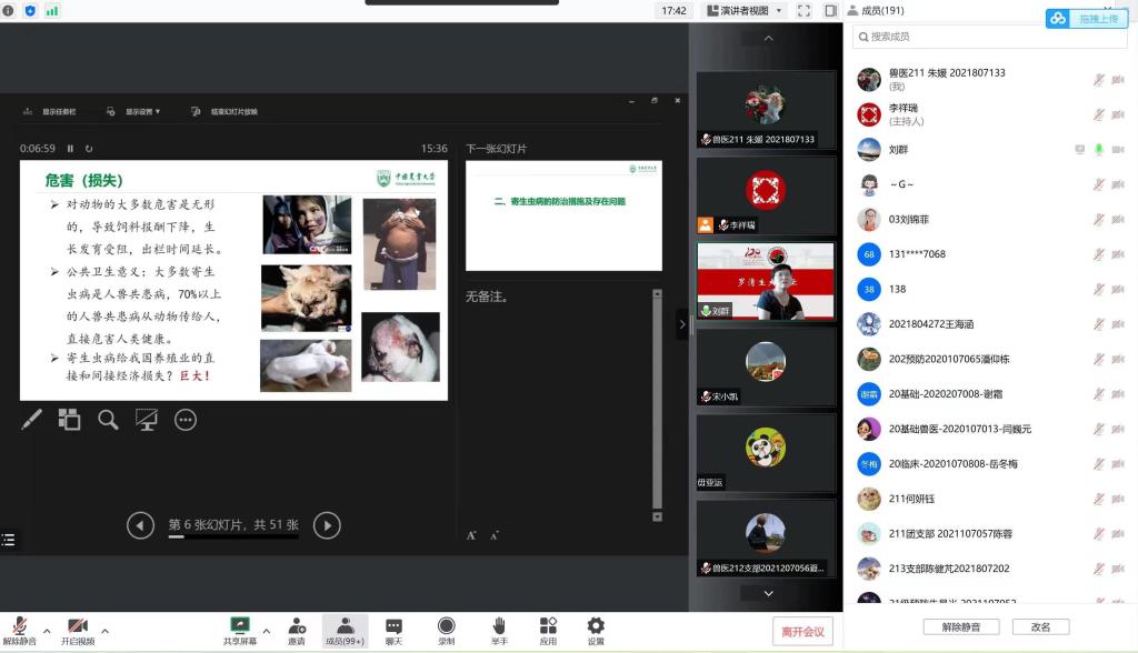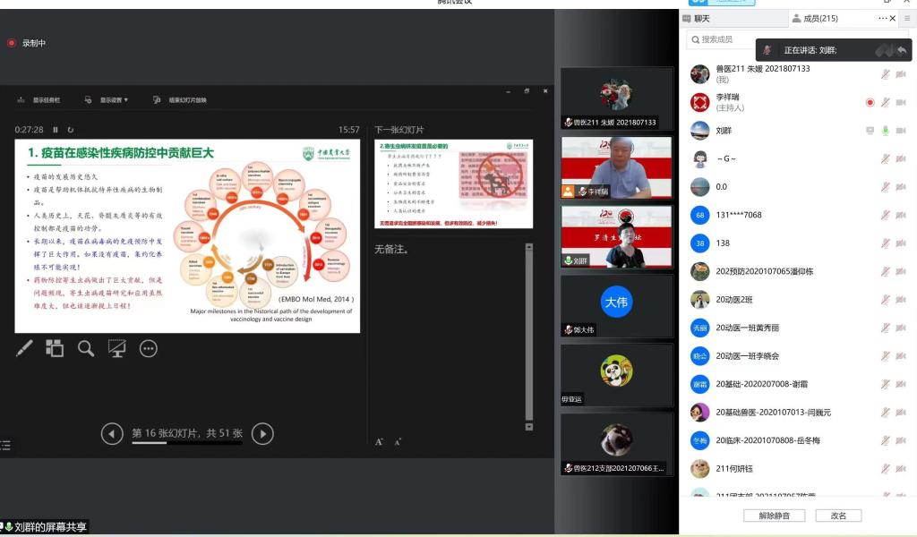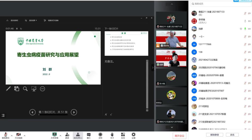 2022年9月15日,德赢Vwin官方区域合作伙伴成功举办罗清生大讲坛。应疫情防控要求,本次讲坛采用线上方式举行。本次论坛有幸邀请到中国农业大学德赢Vwin官方区域合作伙伴教授,中国畜牧兽医学会家畜寄生虫学分会理事人,博士生导师刘群教授进行寄生虫病疫苗研究与应用展望的分享。学院师生积极参加。