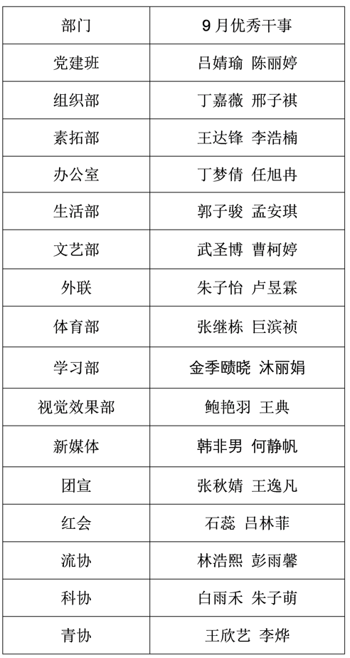【学生工作】第38届党建班、团委学生会各部门9月优秀干事名单公示