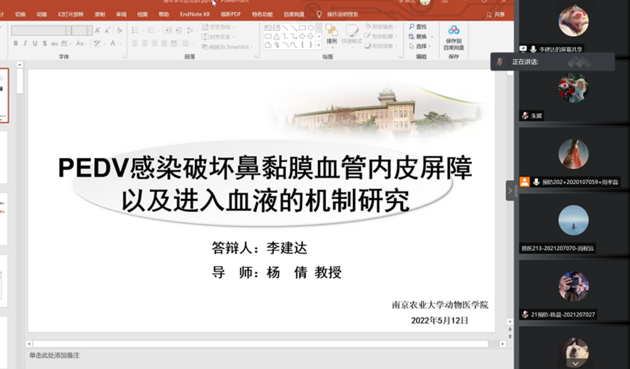 第一位汇报的是来自基础兽医学的李建达,他汇报的题目是《PEDV感染破坏鼻黏膜血管内皮屏障的机制研究》。PEDV不能感染内皮细胞,并且不能直接改变内皮屏障的完整性和通透性,本研究发现PEDV喷鼻感染导致鼻黏膜血管内皮的完整性受损,探究了PEDV感染破坏血管内皮完整性以及进入血液的具体机制,为防控PEDV感染奠定坚实的理论基础。