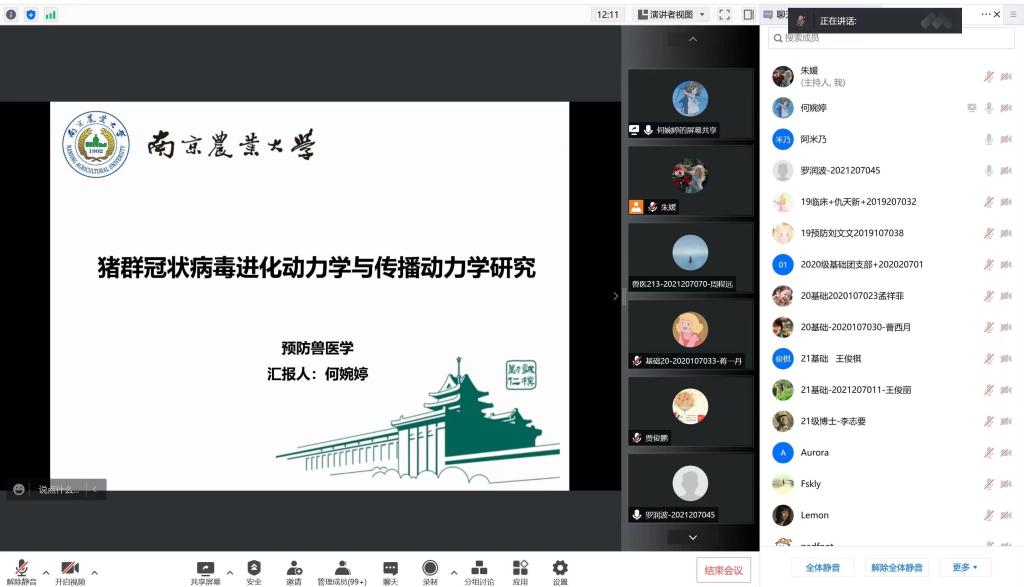 第一位汇报的是来自预防兽医学的何婉婷,她汇报的题目是《猪群冠状病毒进化动力学与传播动力学研究》。猪流行性腹泻病毒PEDV可引起仔猪腹泻、呕吐等症状,本研究基于GLM参数化的离散系统地理推断,构建了中国PEDV的传播动力学模型,并测试病毒传播的潜在预测因子,发现生猪调运是PEDV在中国和全球扩散传播的重要因素,该方法为评估活体动物调运模式和环境因素相关的牲畜传染病风险提供的一个框架。