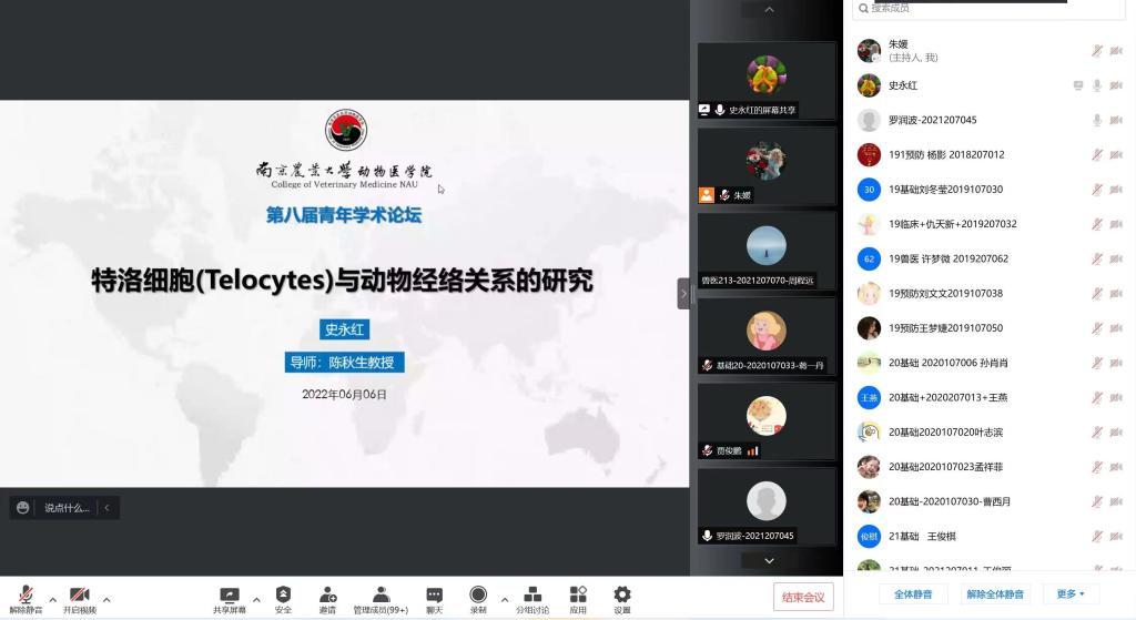 第二位汇报的是来自基础兽医学的史永红,他汇报的题目是《特洛细胞(Telocytes)与中医经络实质的关系》。特洛细胞(TCs)是一种特殊类型的细长间质细胞,它们具有较长的胞质突起,可以在较远的结构之间进行通讯,并且它们存在于许多动物和人类组织的间质中,本研究旨在探讨特洛细胞在不同器官不同的脊椎动物中的特征,通过比较TCs显微特性与经络结构关系,然后提出其可能为经络实质细胞,将有助于解释中医的经络现象。
