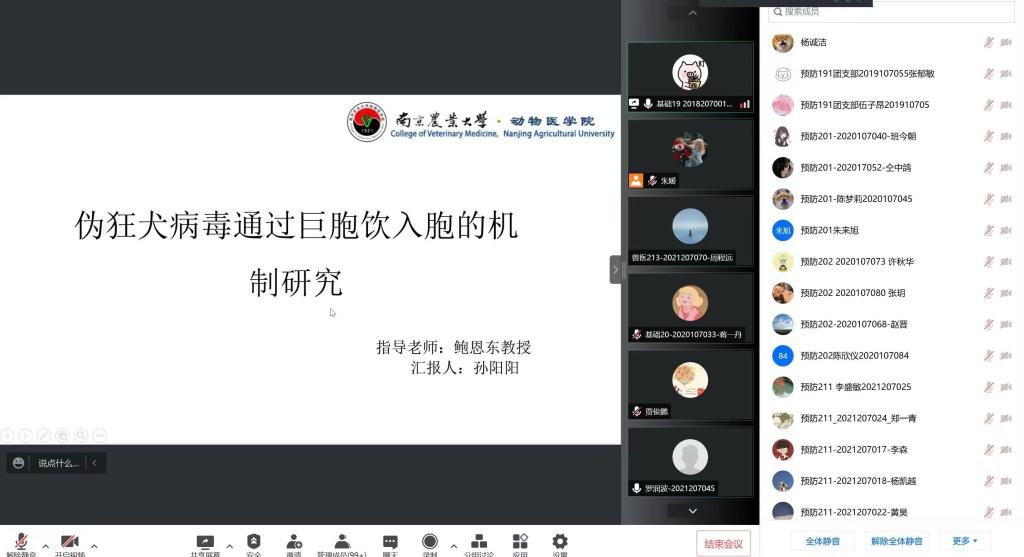 第三位汇报的是来自基础兽医学的孙阳阳,他汇报的题目是《伪狂犬病毒通过巨胞饮入胞的机制研究》。巨胞饮作用是在生长因子刺激下,大鼠巨噬细胞中观察到质膜的波浪状片状延伸,并演变成直径大于0.2μm的囊泡,本研究发现发现PRV进入BHK-21细胞是通过巨胞饮途径,不经过网格蛋白、小窝蛋白介导的内吞途径,不经过膜融合途径,并发现了丝状伪足的5种运动方式,片状伪足的3种运动方式。