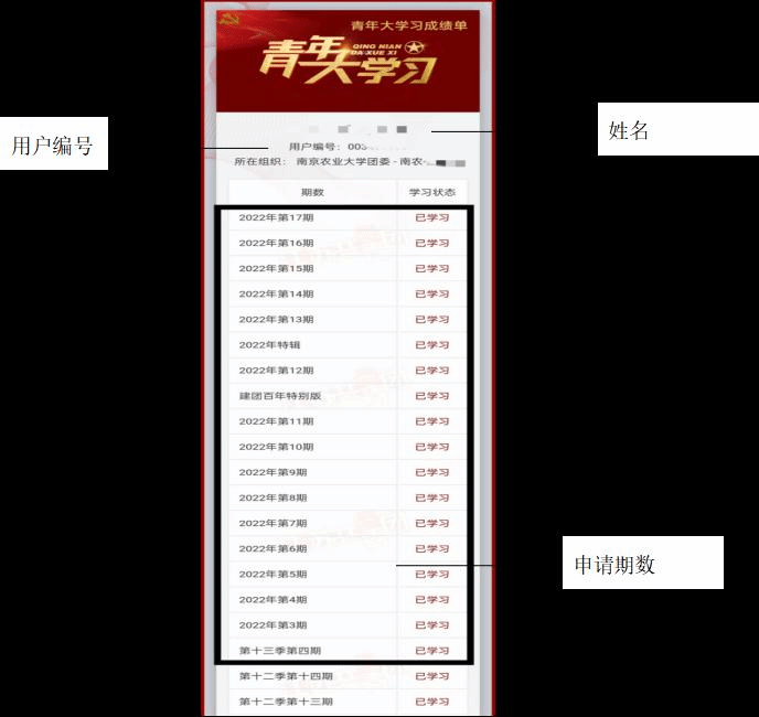 申请学时的学生将青年大学习成绩单命名方式为——“用户编号-姓名-学号-申请学时数量”,并需在成绩单中用方框标出申请学时的对应期数(如图1所示)交至所在二级团组织。