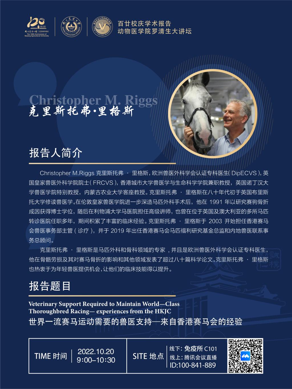 【百廿校庆学术报告】德赢Vwin官方区域合作伙伴罗清生大讲坛-Veterinary Support Required to Maintain World-Class Thoroughbred Racing— experiences from the HKJC