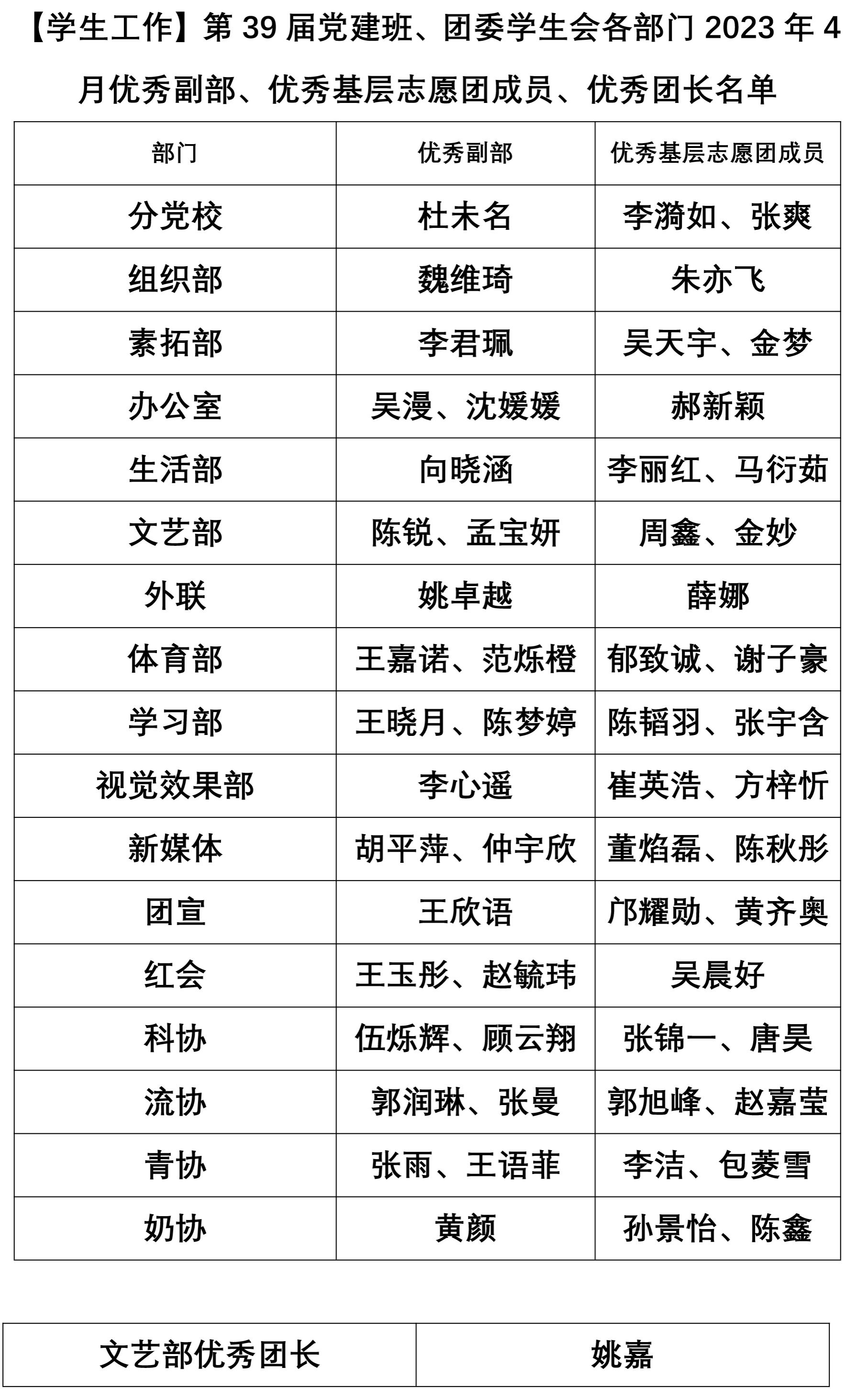 【学生工作】第39届党建班、团委学生会各部门2023年4月优秀副部、优秀基层志愿团成员、优秀团长名单