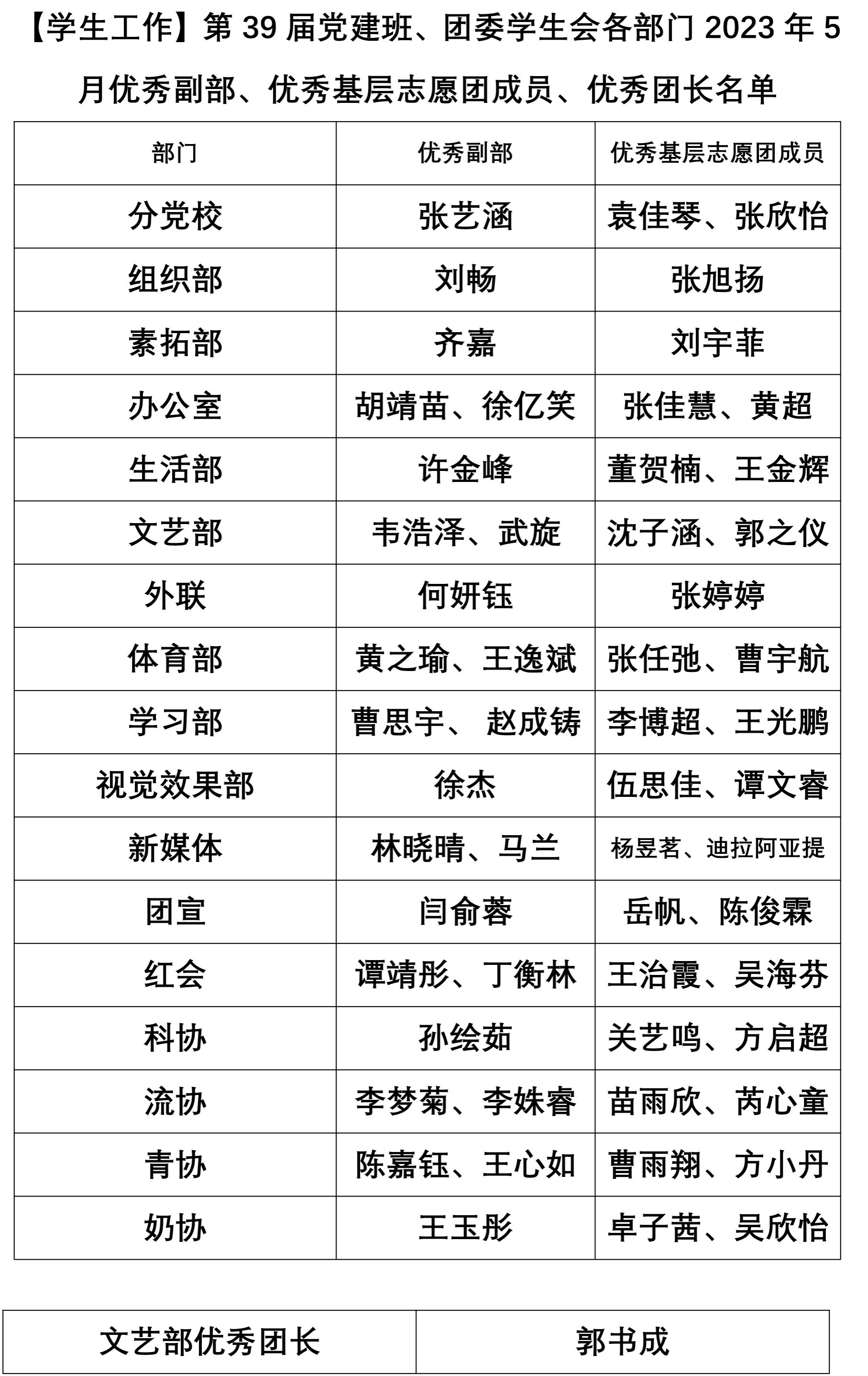 【学生工作】第39届党建班、团委学生会各部门2023年5月优秀副部、优秀基层志愿团成员、优秀团长名单